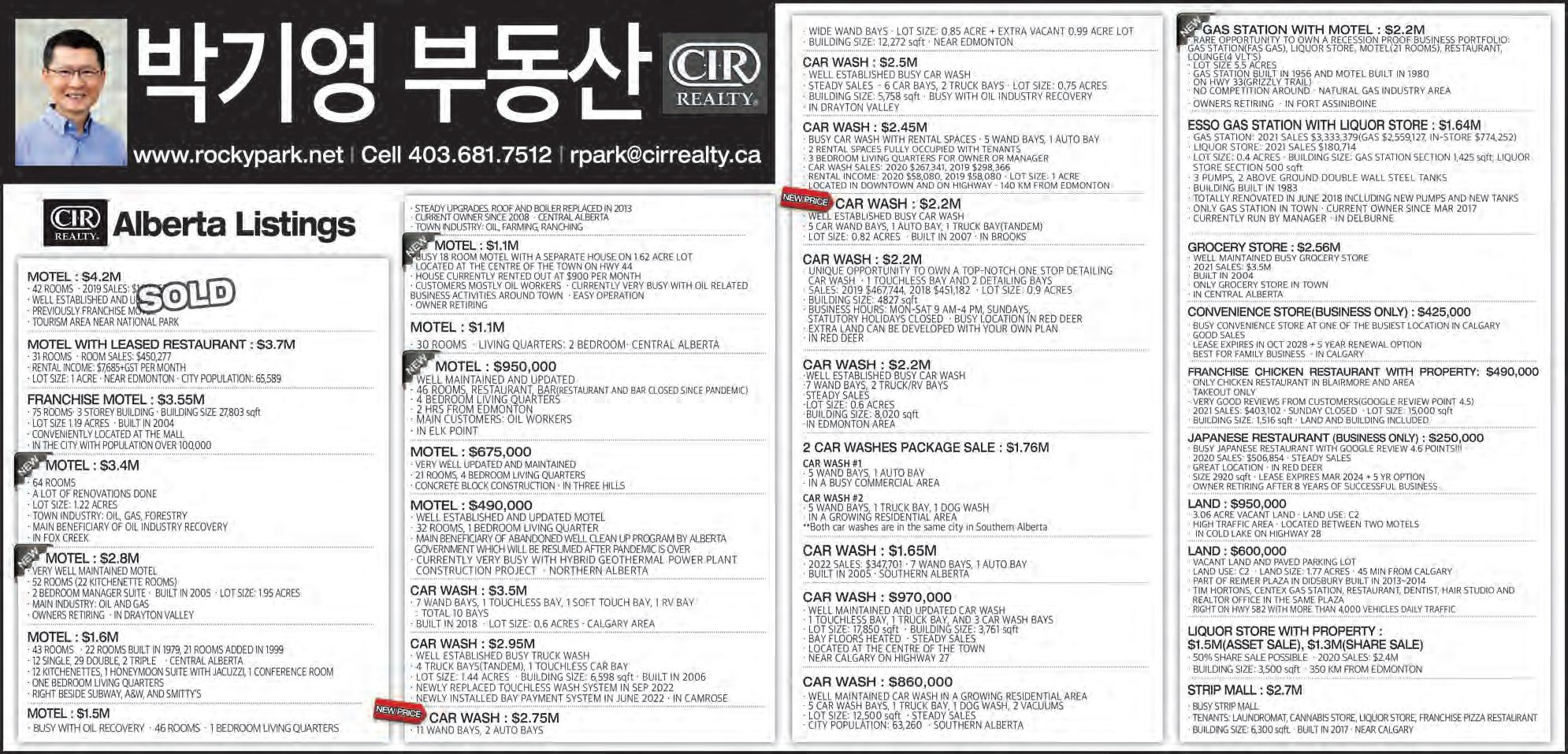 2022년 12월 3일 토요일 C12 조선일보 Sutton Group Westcoast Realty #301-1508 W. Broadway Vancouver V6J 1W8 www.bopark.ca 박보영 부동산은 쉬지 않고 여러분들을 위해서 뜁니다. 박보영 부동산 Vancouver West 전문 Realtor “29년 경력의 전문가” Bo Park(박보영) 직통 : 604) 377-7899 Email : bo@bopark.ca ■ 전문 지역 ■ Vancouver WestㆍDowntown YaletownㆍCoal Harbour SOLD SOLD Full Service Hotel (AB) · Asking: $7.5M · 68 Rooms + 13 Units의 별도 건물 Suites · 꾸준한 $1M 이상의 Room Sales · 10 VLTs와 Tavern, Lounge, Liquor Store · Near Big City High Volume Gas Station + Car Wash (2 Bays) (BC) · Asking: $5.35M · 주변 관광지 많은 B.C. Town · 꾸준한 매출, 안정적인 수익 · 2022 FY Gross Sales; $7.6M Alberta 국립공원내 Korean Restaurant · Asking: $949,000 (Business Only) · 같은 Owner가 30년 운영 · 적절한 Rent Fee와 안정적인 매출 · 관광지내 바쁜 도로 선상의 좋은 Location Alberta 유명 국립공원과 가까운 Japanese, Korean Restaurant · Asking: $350,000(Business Only) ·Alberta 유명 국립공원에서 15분 거리의 인구 1만5천명 Town ·저렴한 Rent Fee와 깔끔한 시설 ·꾸준한 매출, 뛰어난 수익성 Gas Station + Car Wash(3 Bay) (AB) · Asking: $1.99M · Near Edmonton · New Pumps & Gas Storage Tanks (Double Walled Fibre Glass) · Gas($2M), Store($1.2M), Car Wash($70,000) · 니 , , 주 가능합니다. MaxWell Capital Realty(Calgary), Re/Max Bridge City Realty(Saskatoon) NEW NEW NEW NEW Gas Station + Car Wash(6 Bays) (SK) · Asking: $5.85M · 매년 크게 오르는 매출 · SK주 대도시 · 2016년 Renovation과 새로 건축한 Property · NOI(Net Operating Income) Over $1M Gas Station + 21 Unit Lodge + 2 Bays Food Court (SK) · Asking: $6.9M · 매출 올라가고 있는 가능성 많은 사업체 · 독립 건물 형태의 21 Unit의 Lodge와 Recreation Center · !4 Acre의 넓은 땅 · Seller Financing 가능 Franchise Motel on Busy HWY(AB) · Asking: $4.9M · 81 Rooms · 7 Acres의 넓은 땅 · Well Built & Well Kept Building · 지난 1년 Room Sales $1.5M Gas Station + Leased Liquor Store (AB) · Asking:$2.95M · Near Calgary(40 Minutes) · 교통량 많은 도로 선상 · 안정적인 Rental Income과 잘 관리된 Property · Gross Margin; $580,000 Motel + Strip Mall(7 Bays) (AB) · Asking: $5.49M · Alberta 대도시의 Good Location · Renovation 잘 된 78 Room Motel · 꾸준한 Rental Income과 상승중인 Room Sales · 2 Bedroom의 Living Quarter NEW NEW NEW NEW NEW C/S
