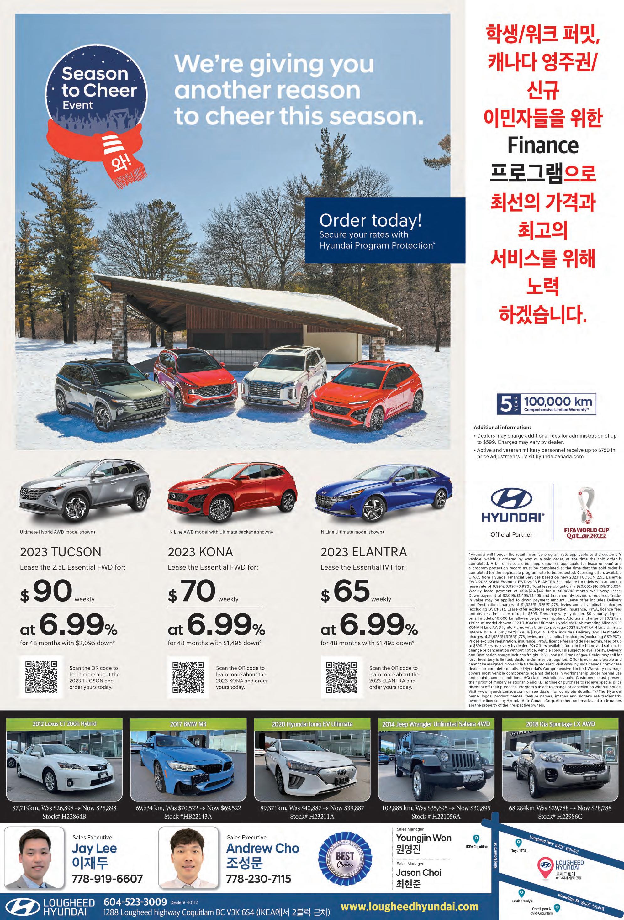 2022년 12월 3일 토요일 A5 조선일보 전 면 광 고 보다 좋은 서비스를 위해 사전예약 부탁 드립니다. Office 604-461-0633 Cell 604-787-7333 2400 Barnet Hwy. Port Moody 오늘 혼다 Winnie를 방문하셔서 확인해보세요 이진아 를 위한 최고의 선택 Winnie Lee 지금타고 계시는 차량을 가지고 오셔서 Honda 차량과 Trade하세요! 리스전문 2023 Full-Changed 하이브리드 완전히 새로워진 기능과 디자인 지금 오더 가능합니다 사전예약 604-787-7333 UPGRADE Future Vehicle NEW