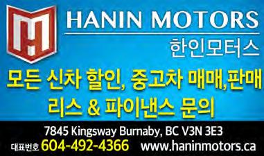 연세대 총회 및 송년회 일시 12 30일(금) 오후 6시 장 소 노스로드 스가든 (9938 ougheed wy, Burnaby) 회비 1인 40달러, 부 부 60달러 문의 동문회장 손종복 (604) 505-8754 65세 이상 시니어 무료상담 버 아름다운 상 센터는 65세 이상 시니어분들과 상실을 경험하신 분 을 위해 4회(45분 회)에 한해 전화 무료 상 을 시행한다 대상 65세 이상 시니 어 또는 상실(가 및 애완동물의 사별 로 인한 상실)하신 분들 상 비 무료 4회, 회당 45분, 전화상 문의 (604) 626-5943, v cc15300 g ail.co