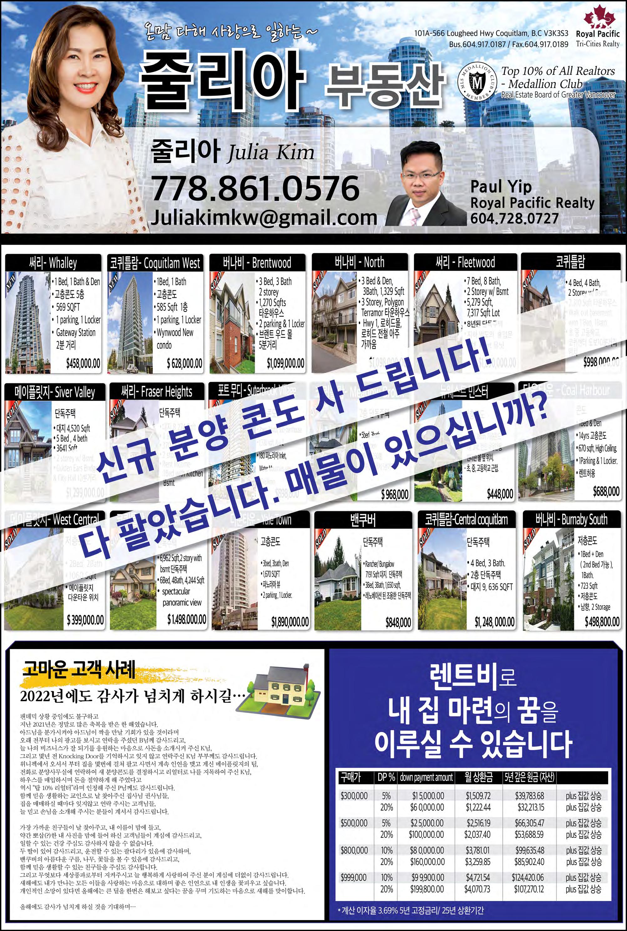 C15 조선일보 Sutton Group Westcoast Realty #301-1508 W. Broadway Vancouver V6J 1W8 www.bopark.ca 박보영 부동산은 쉬지 않고 여러분들을 위해서 뜁니다. 박보영 부동산 Vancouver West 전문 Realtor “29년 경력의 전문가” Bo Park(박보영) 직통 : 604) 377-7899 Email : bo@bopark.ca ■ 전문 지역 ■ Vancouver WestㆍDowntown YaletownㆍCoal Harbour ■ 경력: 15 years+ ■ 실력: 실적 상위 0.1% (MLS FVREB) 메달리언 클럽멤버 ■ 열정: 7am-11pm 7days a week (무료상담) 철저한 전략과 분석! Smart Buying & Selling www. MrOpenHouse.ca 건축공학 및 건설관리전공 리얼터. 전문성에서 앞서갑니다! #140 4664 Lougheed Hwy Burnaby BC V5C 5T5 TEL: 604-299-9680 Sutton Group 1st West Realty 604.781.3467 rick.royal1st@gmail.com 우종훈 부동산 2015 - 2021 7년 연속 광역밴쿠버 TOP 5% REALTOR 비즈니스 매매 2015 2016 2017 2021 2018 2019 2020 사우스 써리 $2,200,000 대지 면적 6,104 sq.ft 실내면적 4,774 sq.ft 방 6개 화장실 7개 조용한 주택가 남향집 주변 좋은 학군과 공원 브랜트우드 지역 신규 분양중! 어메이징 브랜트우드 5 최고의 위치, 럭셔리 빌리지, 미래의 명품관이 입점되는 고급단지 Solo 4 고급 대형 슈퍼 Whole food, Starbucks 와 각종 편의 시설이 구비된 대형단지 Concord 오아시스 유리로 닫을수 있는 발코니 공간! 조용하고 안전한 주택가 고급단지 ★ 로히드 버퀴틀람 지역 ★ ★ 랭리 윌로비 지역 ★ Burquitlam Precidia Foxridge Home Elmwood By Marcon Hayer Town Centre 저층 콘도 분양 임박 177세대 먼저 분양 Aston Townhome 3베드부터 4베스까지 곧 분양 시작 싱글하우스, 로홈 분양중 Master Medallion Member 코퀴틀람 센트럴 $899,900 실내면적 966 sq.ft 방 3대 화장실 2개 골프장 뷰 JUSTSOLD 랭리 윌로비하이츠 $629,000 실내면적 920 sq.ft 방 2개 화장실 2개 5월 입주 예정 전매 물건 파크엔라이드 5분거리 JUSTSOLD 코퀴틀람 센트럴 $789,900 실내면적 863 sq.ft 방 2대 화장실 2개 퓨쳐 공원뷰, 남향 JUSTSOLD 뉴 웨스트민스터 Sold Over Asking $200,000 $899,900 실내면적 1,410 sq.ft 방 3개 화장실 3개 + 덴 모던 디자인, 오픈 컨셉 5분 거리 쇼핑몰 포트 무디 $728,000 실내면적 1,012 sq.ft 방 2개 화장실 2개 + 덴 포트무디 서터브룩 빌리지 각종 편의시설 도보거리 코퀴틀람 센트럴 $3,199,000 대지 면적 6,487 sq.ft 실내 면적 5,575 sq.ft 방 7개 화장실 8개 조용한 주택가 남향집 지하 렌트스윗 뉴웨스트민스터 빅토리아 힐 $539,900 실내면적 663 sq.ft 1 베드 + 1 베스 마스터플랜 커뮤니티 Onni 개발사 랭리 윌로비하이츠 $1,169,000 실내면적 1,766 sq.ft 방 3개 화장실 3개 코너 유닛, 밝은 채광 주변의 편의 시설 및 학교 랭리 월넛그로브 $1,780,000 대지 면적 3,767 sq.ft 실내면적 3,425 sq.ft 방 5개 화장실 4개 조용한 주택가 골프장 뷰 지하 렌트스윗 JUSTSOLD 랭리 월넛그로브 $1,099,000 실내면적 2,229 sq.ft 방 3개 화장실 3개 조용한 주택가 5분거리에 학교, 쇼핑, 공원 JUSTSOLD 랭리 윌로비하이츠 $889,900 실내면적 1,414 sqft 방 3개 화장실 3개 유명건설사 폴리곤 단지내 헬스장, 수영장 각종 편의시설 JUSTSOLD 랭리 윌로비하이츠 라티마 빌리지 $519,900 실내면적 669 sq.ft 1 베드 1베스 JUSTSOLD 써리 센트럴 $489,900 실내면적 517 sq.ft 방 1개 화장실 1개 전철역 및 SFU, 시청 5분 거리 JUSTSOLD JUSTSOLD JUSTSOLD JUSTSOLD 랭리 윌로비하이츠 $779,900 실내면적 1,381 sq.ft 방 3개 화장실 2개 욕슨콘도 전매 7월 입주 예정 JUSTSOLD 랭리 월넛그로브 스시 레스토랑 써리 길포드 빙수가게 $248,900 플라자안에 위치 트래픽이 많음. 매상 꾸준히 증가 OfferAccepted 코퀴틀람 버크마운틴 $2,500,000 대지 면적 5,230 sq.ft 실내 면적 3,314 sq.ft 방 4개 화장실 4개 JUSTSOLD 7년 연속 광역 밴쿠버 TOP 5% REALTOR Master Medallion Member / 604.781.3467 / rick.royal1st@gmail.com
