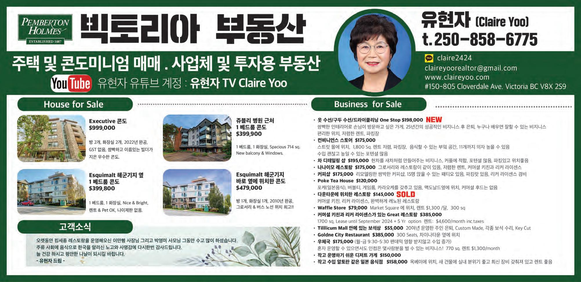 동일한 자리영업, 주인 은퇴 원함, 쉽게 운영, 월 3천 순익 써리 길포드 근처 아파트 Asking $368,000 3층 Riverpoint Complex 1Bedroom 1 Bath 1 parking 713 Square Feet 주소 : 309 15150 108 Avenue Gillmore Place 버나비 길모어 전철역옆 일부할인가격분양 3개빌딩 1,500세대 2024년 가을 입주예정 1 Bedroom $712,900 부터 2 Bedroom $967,900 부터 3 bedroom $1,278,363 Pre-sold $1,317,900 부터 로히드 씨티 1차분 1,500세대 2023년부터 입주 Tower 1, 3601 3 Bed $954,900 Pre-sold 버나비 전철역옆 콘도 Asking $819,000 2 Bed & 2 Bath room 1 Parking & 1 Locker Swimming Pool, Fitness Centre 2203 2388 Madison Aven SOLD SOLD 3배드룸, 2화장실, 2 주차장 2층, 1,430스퀘어피트 13289 71B Avenue 초,중등학교 및 코스코근처 편리한 위치 2092년까지 Pre-paid Lease 건물 : 3,237스퀘어피트 대지 : 6,100스퀘어피트 4 침실, 4 화장실, 6 주차장 주소 : 12132 Irving Street 써리 리스홀드 타운하우스 Asking $298,000 메이플 리지 하우스 34년 된 조용한 동네 아담한 집 Asking $1,225,000 LEASED 버나비 타운하우스 Asking $975,000 • 3 Bed & 1 Bath, 1 parking • 2,226 Square Feet, 조용한 동네 • Address: 5795 Mayview Circle SOLD SOLD SOLD • 회사명 : Building Legacy Management • 연락처 : 778-386-5708 (James Lee) 오랜 경력의 Red Seal Carpenter • 이메일 : Atyourservice8282@gmail.com 주택리노베이션 협력업체 SOLD