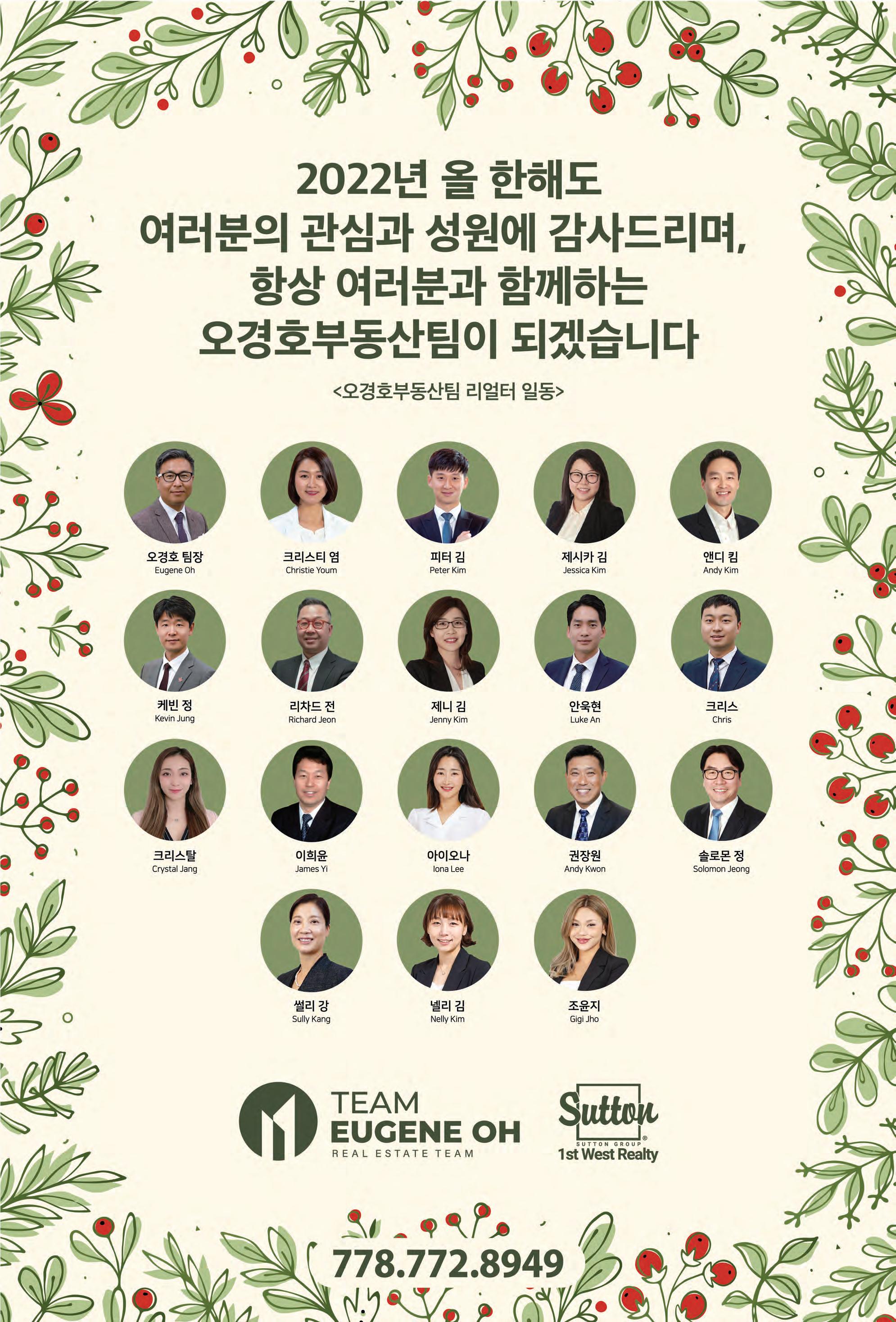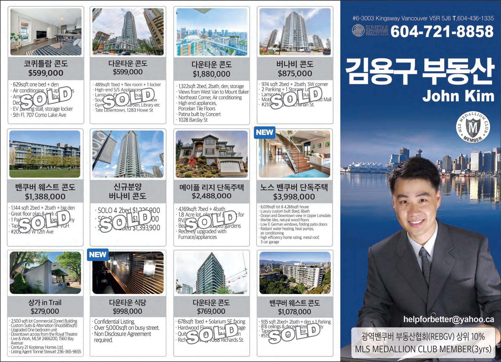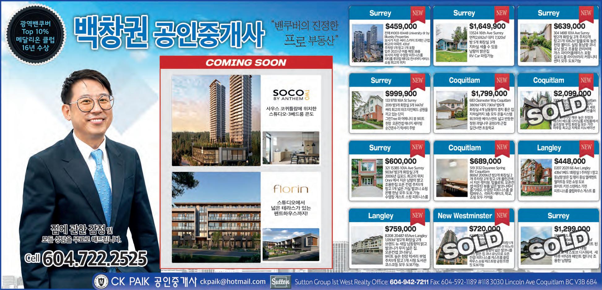 2022년 12월 24일 토요일 C10 조선일보 건축공학 및 건설관리전공 리얼터. 전문성에서 앞서갑니다! #140 4664 Lougheed Hwy Burnaby BC V5C 5T5 TEL: 604-299-9680 Sutton Group 1st West Realty 604.781.3467 rick.royal1st@gmail.com 우종훈 부동산 2015 - 2021 7년 연속 광역밴쿠버 TOP 5% REALTOR 비즈니스 매매 2015 2016 2017 2021 2018 2019 2020 사우스 써리 $2,200,000 대지 면적 6,104 sq.ft 실내면적 4,774 sq.ft 방 6개 화장실 7개 조용한 주택가 남향집 주변 좋은 학군과 공원 브랜트우드 지역 신규 분양중! 어메이징 브랜트우드 5 최고의 위치, 럭셔리 빌리지, 미래의 명품관이 입점되는 고급단지 Solo 4 고급 대형 슈퍼 Whole food, Starbucks 와 각종 편의 시설이 구비된 대형단지 Concord 오아시스 유리로 닫을수 있는 발코니 공간! 조용하고 안전한 주택가 고급단지 ★ 로히드 버퀴틀람 지역 ★ ★ 랭리 윌로비 지역 ★ Burquitlam Precidia Foxridge Home Elmwood By Marcon Hayer Town Centre 저층 콘도 분양 임박 177세대 먼저 분양 Aston Townhome 3베드부터 4베스까지 곧 분양 시작 싱글하우스, 로홈 분양중 Master Medallion Member 코퀴틀람 센트럴 $899,900 실내면적 966 sq.ft 방 3대 화장실 2개 골프장 뷰 JUSTSOLD 랭리 윌로비하이츠 $629,000 실내면적 920 sq.ft 방 2개 화장실 2개 5월 입주 예정 전매 물건 파크엔라이드 5분거리 JUSTSOLD 코퀴틀람 센트럴 $789,900 실내면적 863 sq.ft 방 2대 화장실 2개 퓨쳐 공원뷰, 남향 JUSTSOLD 뉴 웨스트민스터 Sold Over Asking $200,000 $899,900 실내면적 1,410 sq.ft 방 3개 화장실 3개 + 덴 모던 디자인, 오픈 컨셉 5분 거리 쇼핑몰 포트 무디 $728,000 실내면적 1,012 sq.ft 방 2개 화장실 2개 + 덴 포트무디 서터브룩 빌리지 각종 편의시설 도보거리 코퀴틀람 센트럴 $3,199,000 대지 면적 6,487 sq.ft 실내 면적 5,575 sq.ft 방 7개 화장실 8개 조용한 주택가 남향집 지하 렌트스윗 뉴웨스트민스터 빅토리아 힐 $539,900 실내면적 663 sq.ft 1 베드 + 1 베스 마스터플랜 커뮤니티 Onni 개발사 랭리 윌로비하이츠 $1,169,000 실내면적 1,766 sq.ft 방 3개 화장실 3개 코너 유닛, 밝은 채광 주변의 편의 시설 및 학교 랭리 월넛그로브 $1,780,000 대지 면적 3,767 sq.ft 실내면적 3,425 sq.ft 방 5개 화장실 4개 조용한 주택가 골프장 뷰 지하 렌트스윗 JUSTSOLD 랭리 월넛그로브 $1,099,000 실내면적 2,229 sq.ft 방 3개 화장실 3개 조용한 주택가 5분거리에 학교, 쇼핑, 공원 JUSTSOLD 랭리 윌로비하이츠 $889,900 실내면적 1,414 sqft 방 3개 화장실 3개 유명건설사 폴리곤 단지내 헬스장, 수영장 각종 편의시설 JUSTSOLD 랭리 윌로비하이츠 라티마 빌리지 $519,900 실내면적 669 sq.ft 1 베드 1베스 JUSTSOLD 써리 센트럴 $489,900 실내면적 517 sq.ft 방 1개 화장실 1개 전철역 및 SFU, 시청 5분 거리 JUSTSOLD JUSTSOLD JUSTSOLD JUSTSOLD 랭리 윌로비하이츠 $779,900 실내면적 1,381 sq.ft 방 3개 화장실 2개 욕슨콘도 전매 7월 입주 예정 JUSTSOLD 랭리 월넛그로브 스시 레스토랑 써리 길포드 빙수가게 $248,900 플라자안에 위치 트래픽이 많음. 매상 꾸준히 증가 OfferAccepted 코퀴틀람 버크마운틴 $2,500,000 대지 면적 5,230 sq.ft 실내 면적 3,314 sq.ft 방 4개 화장실 4개 JUSTSOLD 7년 연속 광역 밴쿠버 TOP 5% REALTOR Master Medallion Member / 604.781.3467 / rick.royal1st@gmail.com