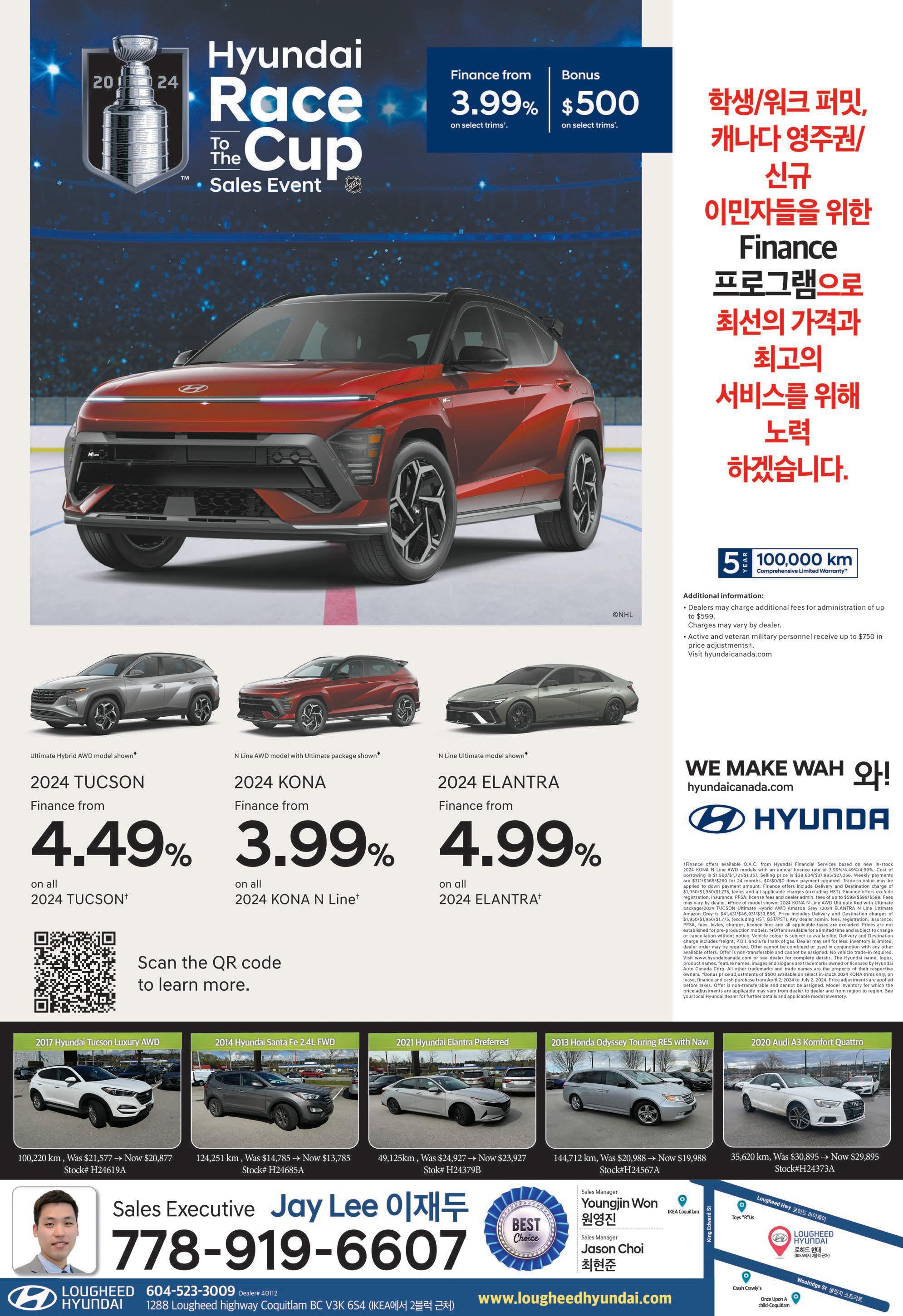 2024년 5월 4일 토요일 B7 조선일보 GAS SAVERS 스포티지 (하이브리드는 선주문 / 가스 차량 주문) 가스 / 하이브리드 / 프러그인 하이브리드 소렌토 가스 /하이브리드/ 플러그인 하이브리드 니로 EV6 Hard Rock Casino Toys R Us IKEA 한남 King Edward St. Northroad Lougheed Hwy United Blvd 코퀴틀람 한인타운에서 5분거리! (코퀴틀람 가구거리 홈디포/Hard Rock Casino 맞은편) 1881 United Blvd Coquitlam BC 기아 웨스트 1-866-980-3427 윤성욱 Terry Yoon Korean Account Manager 604.621.9151 e-mail : terryoon@kiawest.com 중고차 100대 이상 보유 사전예약하신 후 방문해주세요 자동차에 관한 모든 것! 지금 바로 전화주세요! 중고차 매입 도와드립니다 중고차량 항시 100대 이상 보유 유학생 및 신규 이민자, 워크퍼밋 보유자도 가능 새차 중고차 할부 또는 리스 EV9 기아 웨스트 딜러쉽에서 주문하실 수 있습니다