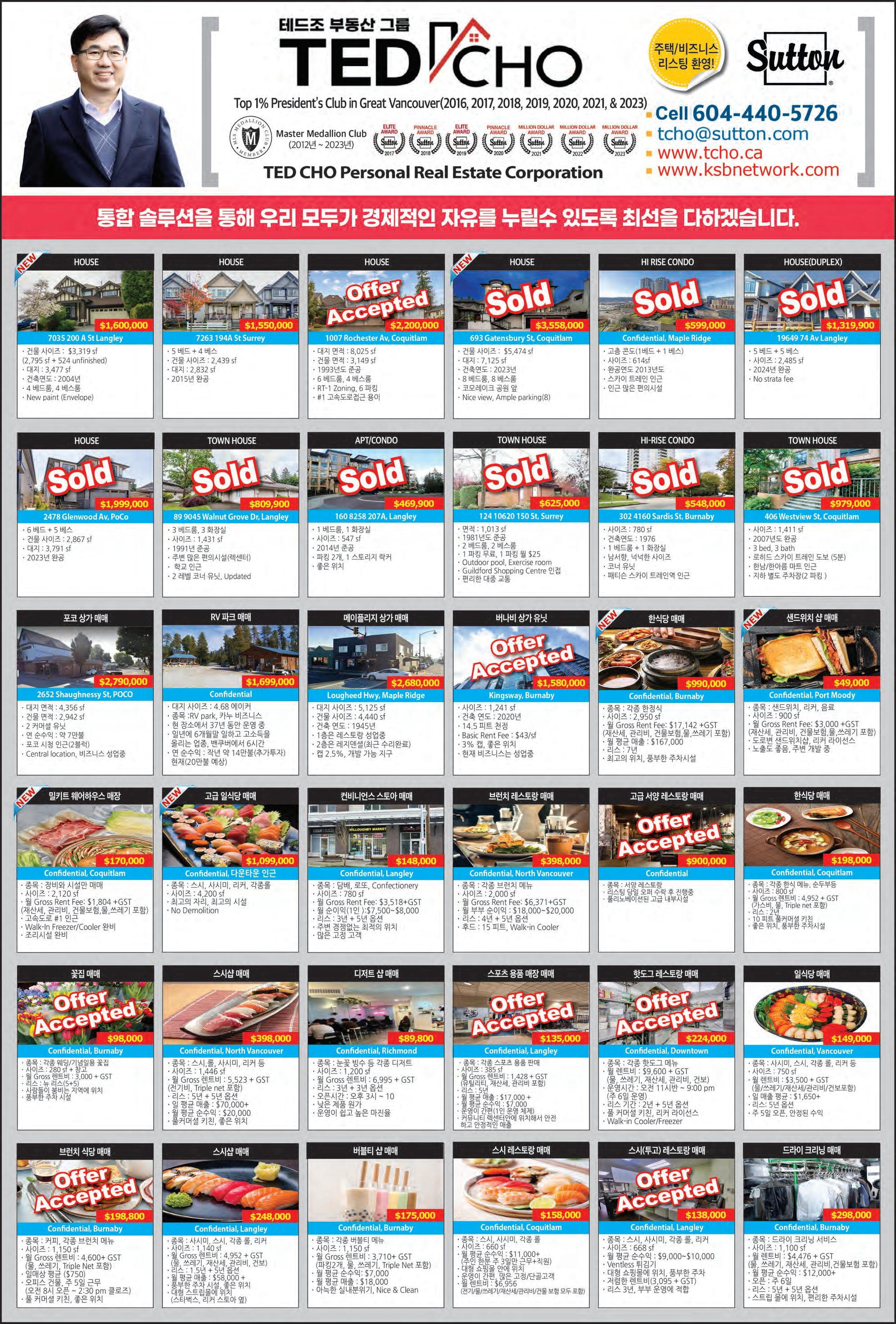 2024년 3월 23일 토요일 B12 조선일보 SOLD SOLD Full Service Hotel (AB) · Asking: $7.5M · 68 Rooms + 13 Units의 별도 건물 Suites · 꾸준한 $1M 이상의 Room Sales · 10 VLTs와 Tavern, Lounge, Liquor Store · Near Big City High Volume Gas Station + Car Wash (2 Bays) (BC) · Asking: $5.35M · 주변 관광지 많은 B.C. Town · 꾸준한 매출, 안정적인 수익 · 2022 FY Gross Sales; $7.6M Alberta 국립공원내 Korean Restaurant · Asking: $949,000 (Business Only) · 같은 Owner가 30년 운영 · 적절한 Rent Fee와 안정적인 매출 · 관광지내 바쁜 도로 선상의