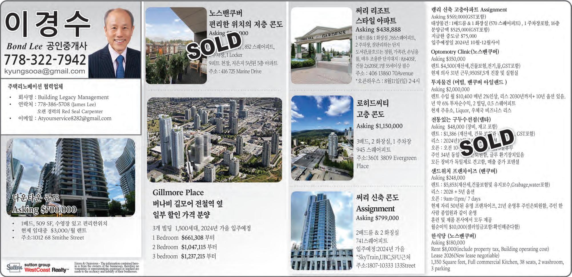 비즈니스로 부터 주택 & 상가구매까지 778-855-0240 ericleeprec@gmail.com