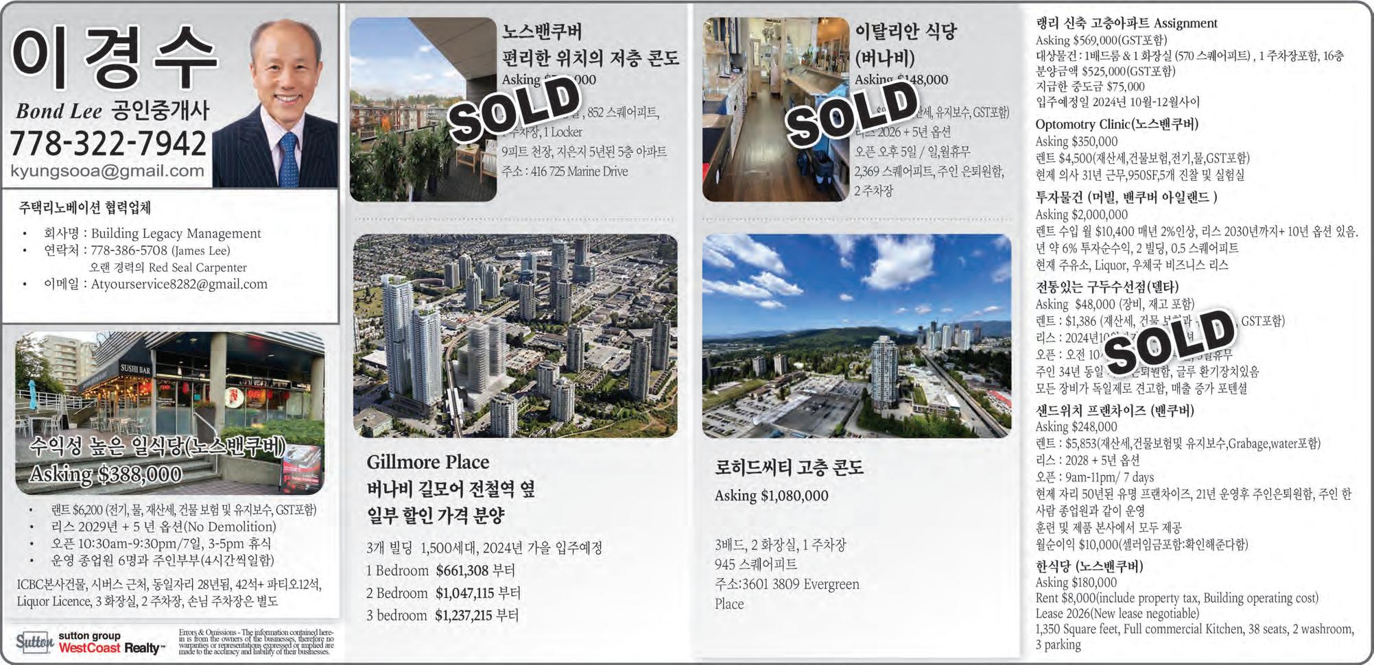 비즈니스로 부터 주택 & 상가구매까지 778-855-0240 ericleeprec@gmail.com