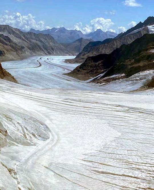 Aletsch Glacier 長 度超過 2 2 公里,是阿爾卑斯山區最長冰河,闊度約為 8 0 平方公里,恆 冰層厚達 1 公里,夏天當覆蓋著冰面的雪頂消融時,便可清楚看到獨特的雪痕冲刷和冰蝕 現象。如果再細心觀察的話,會見到這裡的冰雪不是純白一色,而是雪面上帶有褐斑點點。