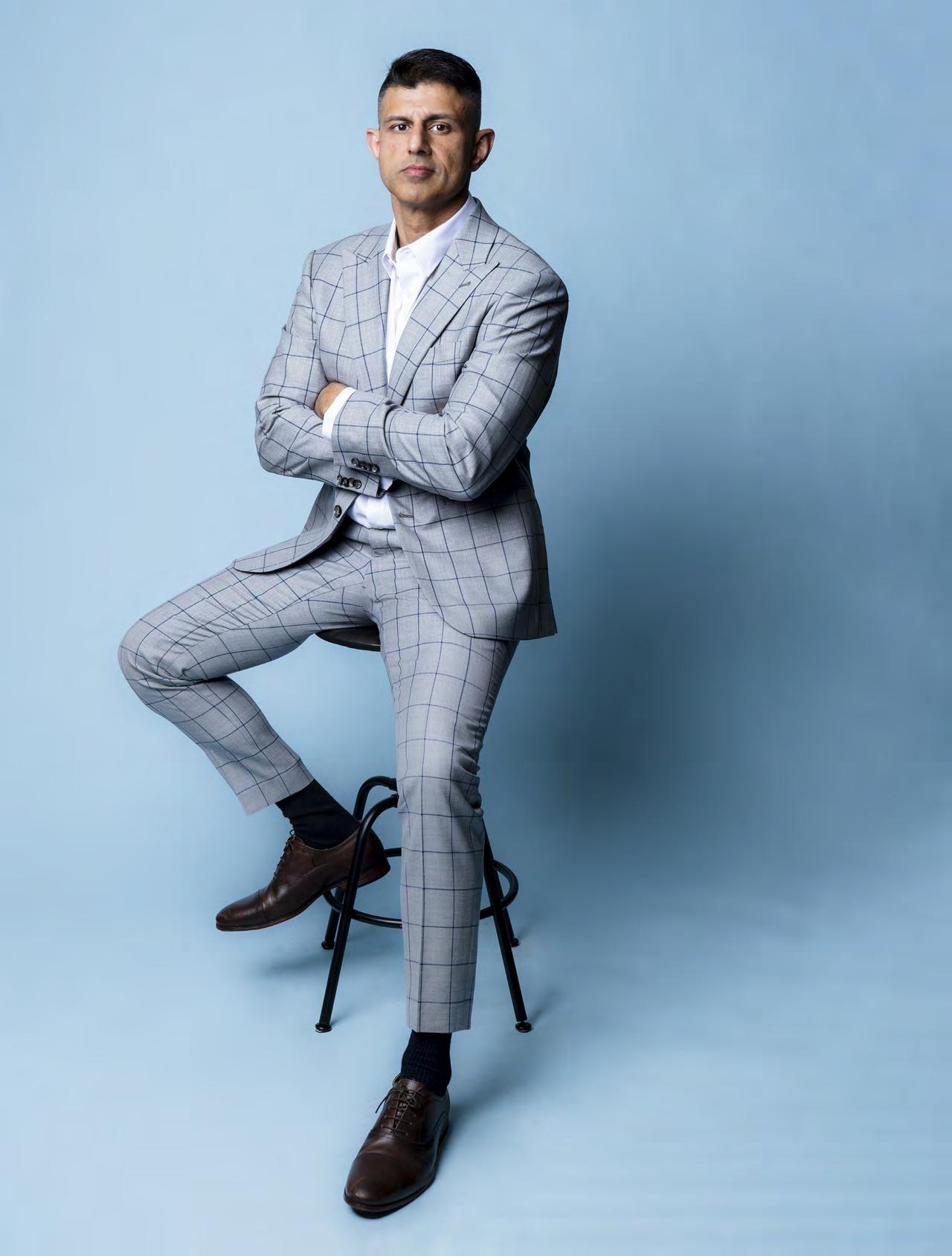 He describes his personal style as “left of centre” and adds a few of his unique choices in life, like “vintage cars, vintage trumpets, intentionally bold or nuanced shirts, jackets and shoes. A mix of retro and ultramodern in spirit. My cherry 1999 Beemer is in the folder.”