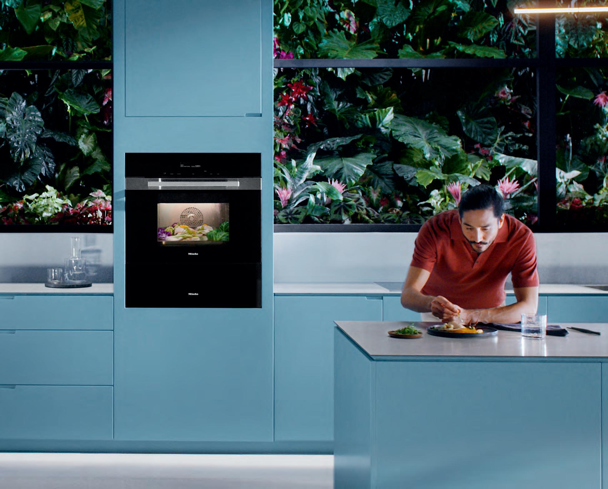 custom cabinet panel. The lower cabinets are finished in Parchement Matte.