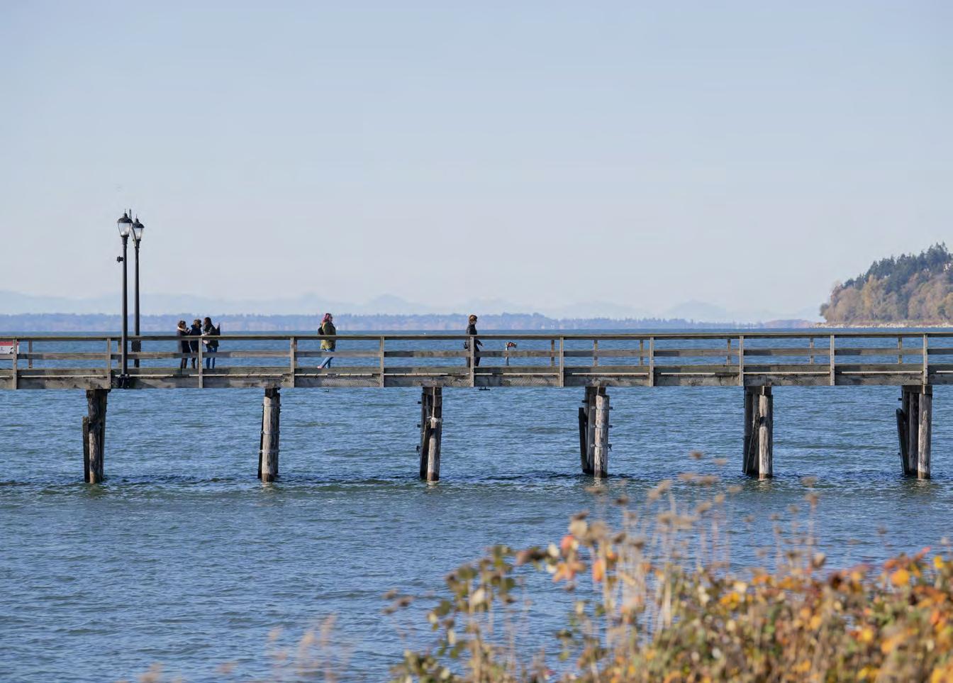 不過,吃東西之前,我們還是先沿著海邊散散步。白石碼 頭最初建於1914年,向海中延伸 470 米,供蒸汽船停靠, 是加拿大最長的碼頭。我們走到碼頭盡頭,眺望海灣,一 個風箏衝浪者乘風破浪,輕鬆自如。上方,一隻白頭鷹正 在盤旋,尋找水中的獵物。對面華盛頓州的 Semiahmoo 度假村似乎近在咫尺,感覺完全可以游過去。