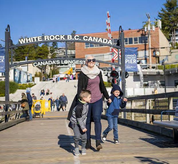 White Rock’s West and East beaches are connected by a two-kilometre promenade that’s an irresistible draw for a leisurely stroll on a beautiful day. Families push strollers, couples walk hand in hand and children lick ice cream cones as they move slowly along the path. There’s lots of eye candy on the journey, between the public art along the waterfront, the view, the people-watching and the unmissable white rock for which the community is named. The four-metrehigh monolith, likely a glacial deposit left behind thousands of years ago, maintains its white colour thanks to regular TLC from the City of White Rock.