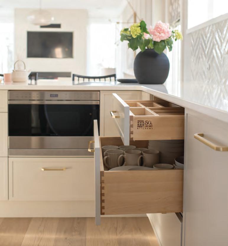 Standard dovetailed drawers show off customizable cutlery and dishware organizers. The dishwasher is hidden by a