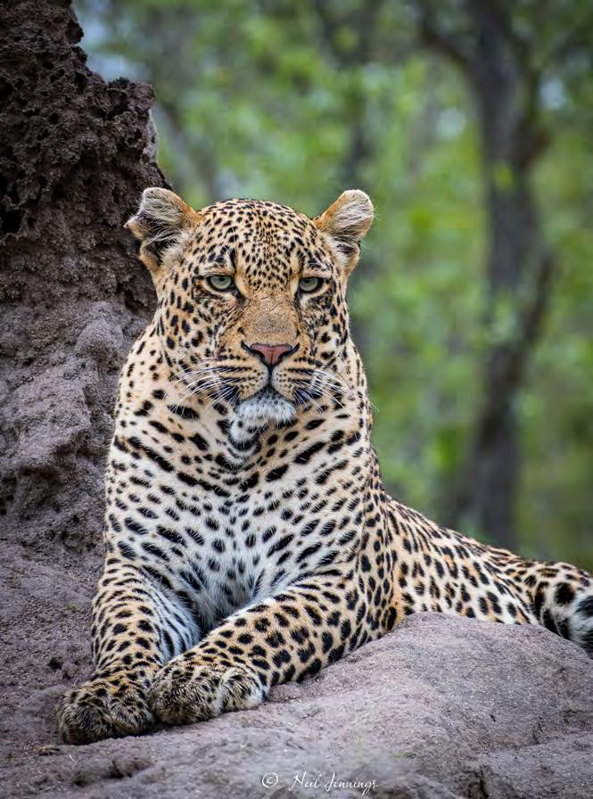 在非洲叢林中駕車遊獵需要耐心,而且不能保證一定能看到野 生動物。有些車程很長,卻很少能看到野生動物,有些則非常 熱閙,每個角落都有動物出沒。最後一天,我們驅車越野,在 灌木叢中蹣跚前行,越過巨石和倒下的樹木,直到抵達一棵樹 下,看到一隻花豹幼崽呆在高高的樹枝上。它四處張望尋找母親, 而它的母親很可能外出狩獵,消失了一兩天。