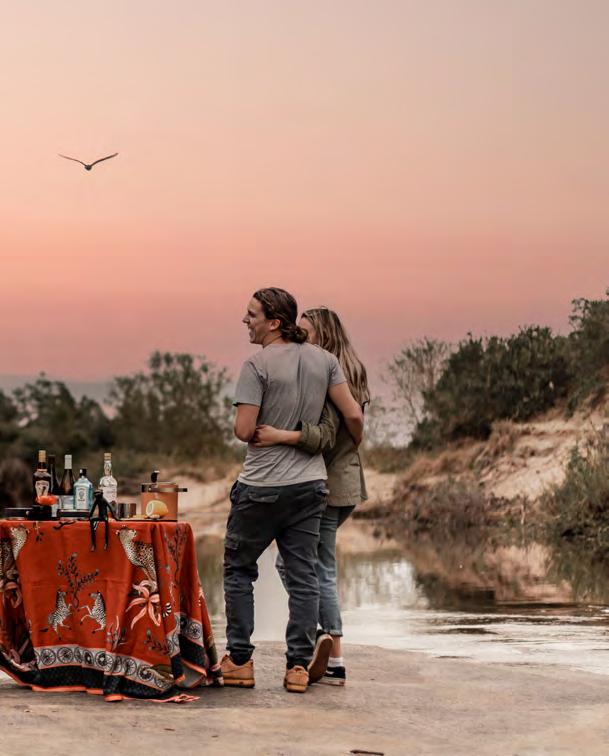 回到旅舍後,我們在私人泳池中度過悠閒的下午時光,觀看大 象和捻角羚羊 kudu 在我們面前的乾涸河岸上移動。我們享用 豐盛的食物,在寬大的真皮沙發上與其他客人邊喝飲料邊交談, 翻看相機,盡情欣賞當天的精采照片。在燭光晚餐中,我們享 用可口的葡萄酒配餐,聆聽來自開普省的釀酒師分享他們的葡 萄種植技術。入夜后,我們在工作人員的護送下回到房間,以 防路上遇到動物,在鋪著精美床單的四柱床上酣然入睡。