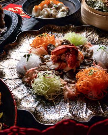齊掏拌,把這動作形容之為「撈起」。撈在粵語中有掏拌也有風生 水起的意思,因為意頭好,寓意「越撈越旺」而流行起來,之後這 道菜流傳到香港,以至各大小餐廳年菜中必備有撈起這道菜肴。 主廚將這道較為庶民風味的地方菜添加了名貴食材如烹煮至溏心的 36頭乾鮑和原隻龍蝦,成為了升級豪華版本,加了龍蝦又暗合龍年 的喻意,而且食味更佳,傳統中菜與加拿大食材相結合,又不離風 生水起的好意頭的原意,相信你我的年夜飯中必然有它了! 年菜中必然有魚,寓意年年有餘,但中式吃魚不外是原條清蒸就是 金華玉樹麒麟斑塊,卅二公館的主廚今回的年菜卻另闢蹊徑,設計 了一道火焰原條游水魚,把加了泡椒和味料蒸好的游水鰂在席間灒 酒炙燒,讓加添在魚肉上面的辣椒、蔥絲、醬料和魚肉都帶有少許 煙熏的焦香,滋味更勝清蒸魚灒熱油的效果,吃過這道創新的火焰 鰂魚,願大伙都會火火紅紅,年年有餘。