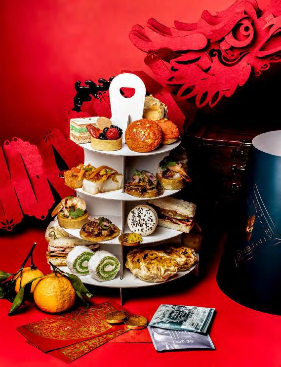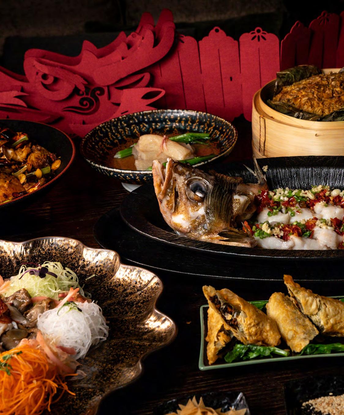 歲次丙辰,為喜迎龍年,主廚Chef He特別設計了一系列新春年菜,計有鮑魚龍蝦撈起、 高湯竹笙官燕、陳年花雕栗子雞、珊瑚白魚西施、蠔豉發財腐皮卷、火焰原條游水魚、 辣蟹炒蘿蔔糕、荷葉飯等。