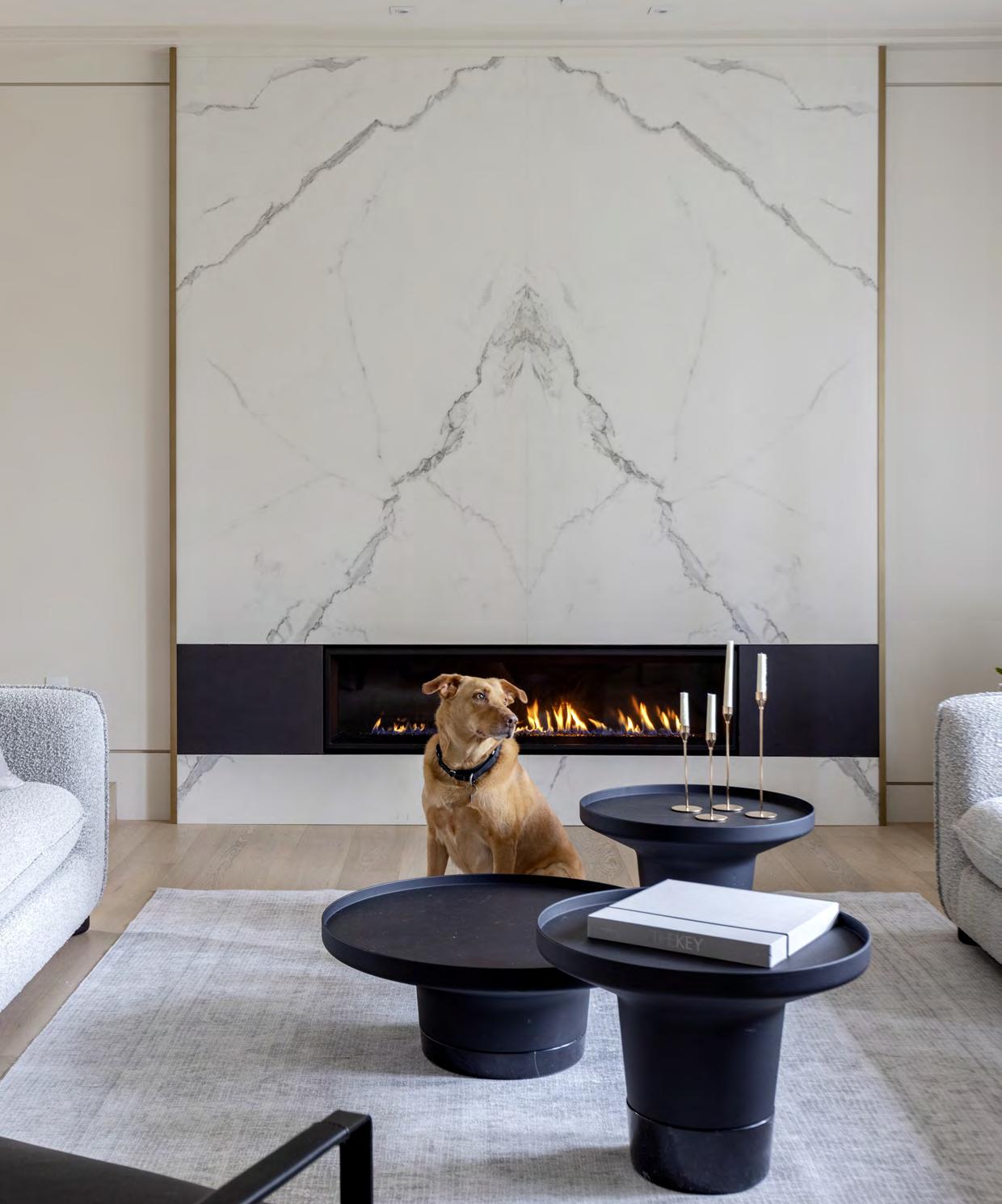回到客廳,相鄰家庭活動室内的橫向壁爐的四周被大理石所覆蓋。 透過一道來自比利時的 33 呎的玻璃推拉門,開闊的戶外生活空間 一覽無遺。