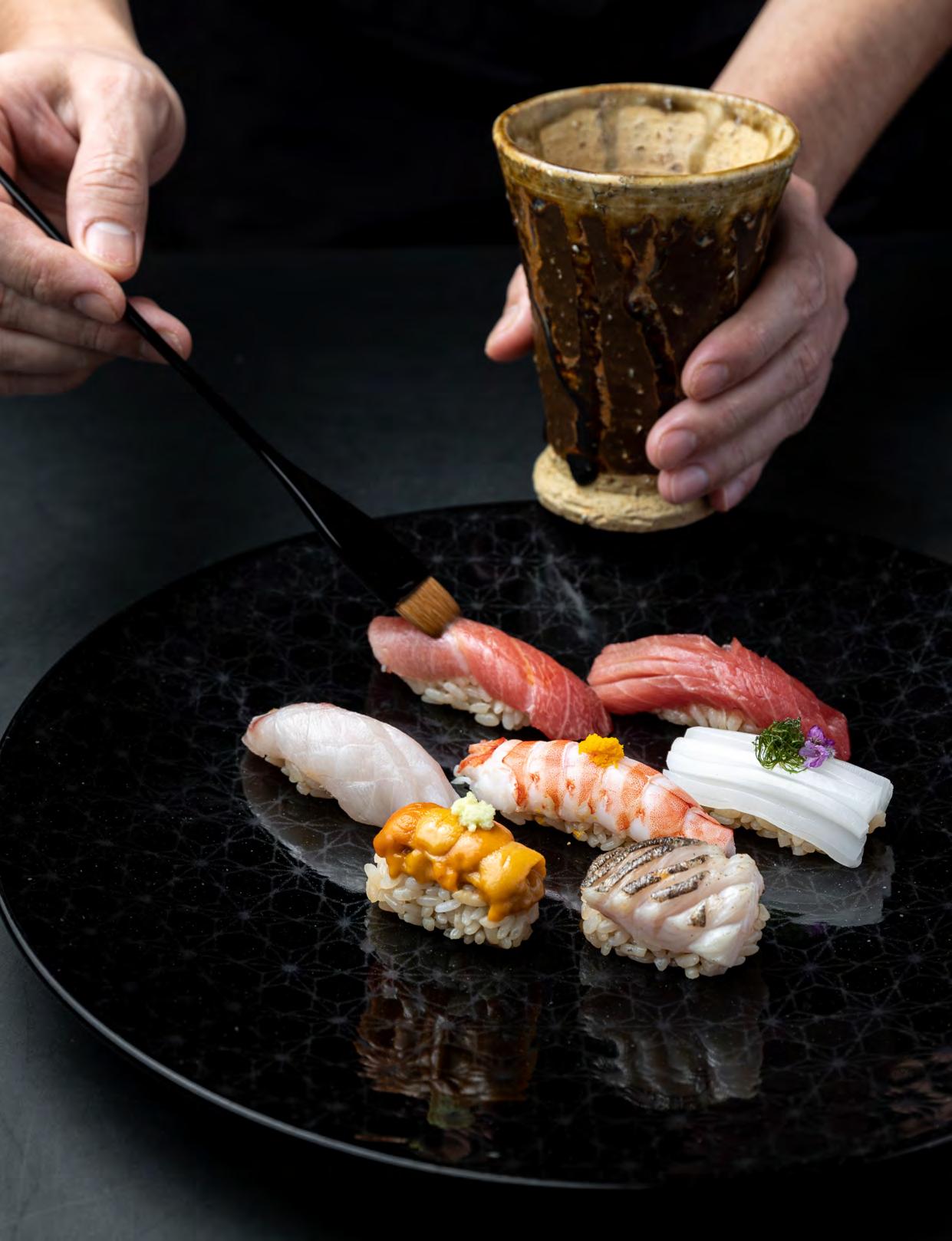 Chef Satoshi專注於採用優質日 本食材和供應omakase,而他的 omakase更是獨樹一幟,以現代 風格的江戶前(Edomae)握壽司 為亮點。整個omakase的舖排 最先上桌是一式五款前菜和茶碗 蒸(chawanmushi),之後便依著 味道由淡至濃的十數款握壽司上 場了。