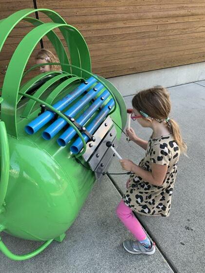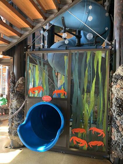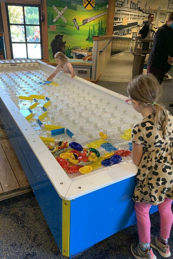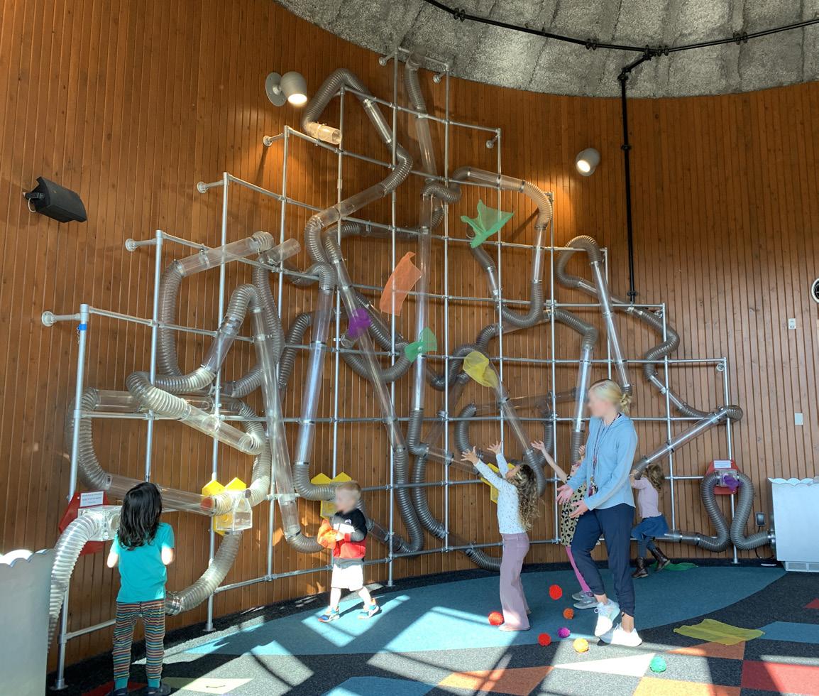 markers, recycled materials, and plenty of other supplies to create a unique masterpiece. “Fabulous Forest” invites kids to perform on stage and ascend into a Tree House. Snug Harbor is a safe and fun spot especially for toddlers and preschoolers. Connecting the floors of the huge museum is a play place-style climbing structure and slide. Because the day we visited was a sunny one, we got to spend a good chunk of our midday in the Outdoor Discover Center, a half-acre space featuring a lighthouse and schooner, children’s garden, dino dig, log scramble and even trikes and helmets available to borrow. On top of all of the exhibits and activities, the museum contains a café, lockers, nursing nooks and lots of grownup seating throughout, to keep families comfortable. Our girls loved the Ballcano Vortex and the dino dig—both tactile experiences that invited them to get their hands wet and dirty, in all the right ways! We probably could have stayed and played all day long, but we had more to explore, and just one day to do it.