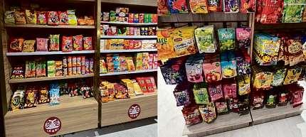 crackers,andcandiesindozensof flavours,includingallkindsoffruit, cola,andicedtea Therearepremade milkteasbythebottleaswellasinstant milkteaandotherdrinkpowders, andchipsflavouredlikesteakor seafood Particularlyhandyforhotelor casinoguests,theshopalsohasafew necessitiesandstandardconvenience