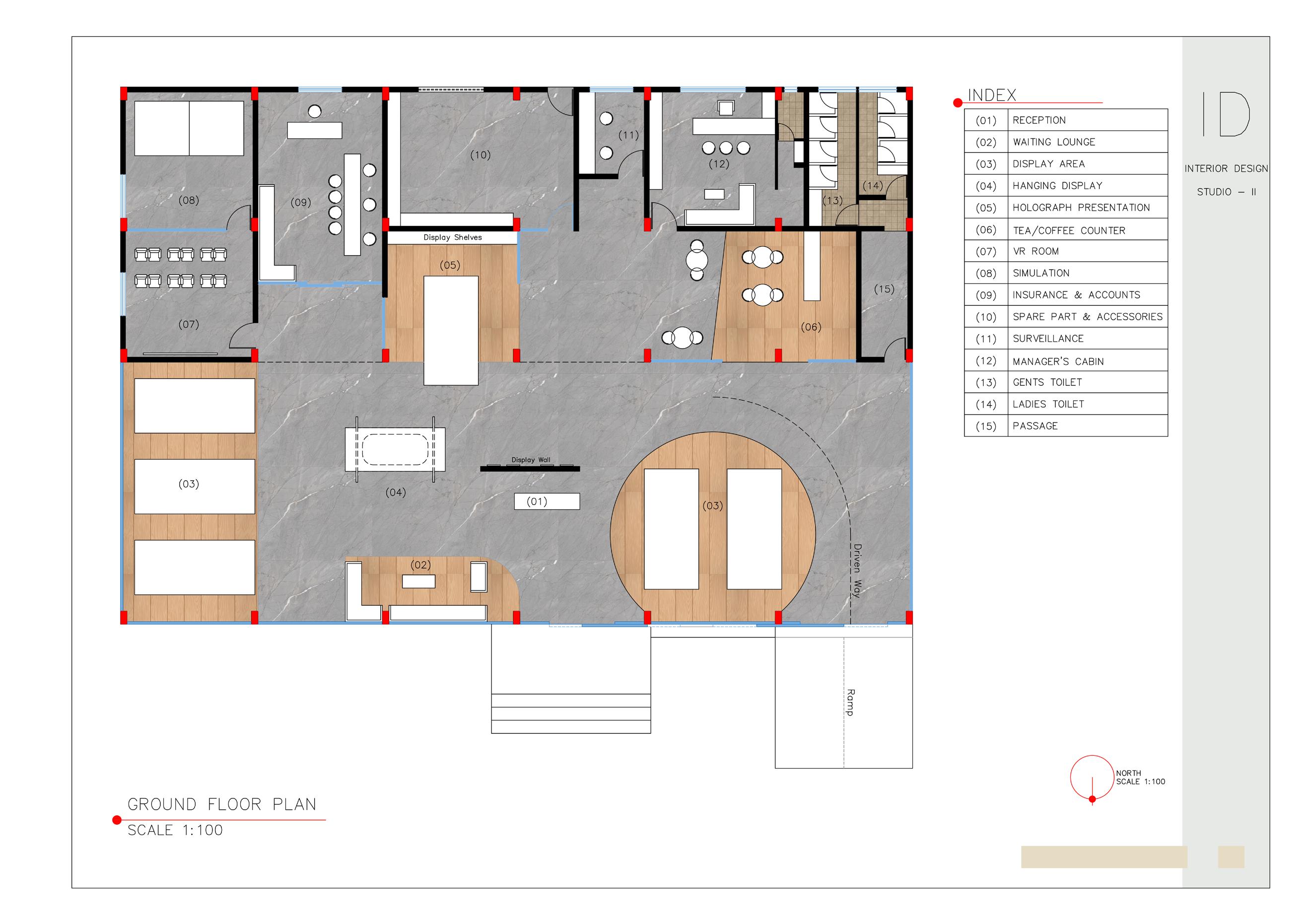 MEZZANINE FLOOR PLAN SCALE 1:100 7'-8 1 2 " 12'-2 1 2 " 1'-6" 1'-6" 1'-6" 1'-6" 1'-6" 1'-6" 1'-6" 1'-6" 2" x 3" MS PIPES WELDED ACROSS JUNCTIONS 3" x 3" MS PIPES MAIN SUPPORTS SB11 + 3'0" 2' PT. ABOVE SHUTTER 2'-5 1 2 " 2'-5 1 2 " 01 SB10 4M CHARGING POINT [4] 02 SB11 6M 2SUSPENDED LIGHTS IN SERIES, 1 CHARGING POINT, 3 SURFACE LIGHT [5] 5'-11 1 2 " 5'-11 1 2 " 7'-9" 9' INDOOR CEILING 2" x 3" MS PIPES WELDED ACROSS JUNCTIONS 6" 8' 6" 6" 6'-9" 6" EQ EQ EQ EQ 3'-10 1 2 " 3'-10 1 2 " 2'-6 1 2 " 3'-11" 5'-5 1 2 " 7'-9" 1' 6" 9" LED 6" 6'-9" 6" 7'-9" 1'-8 1 2 " 2' 3' 1' 4' 3' 2'-6" VANDANA ASSOCIATES A3 For Approval Checked