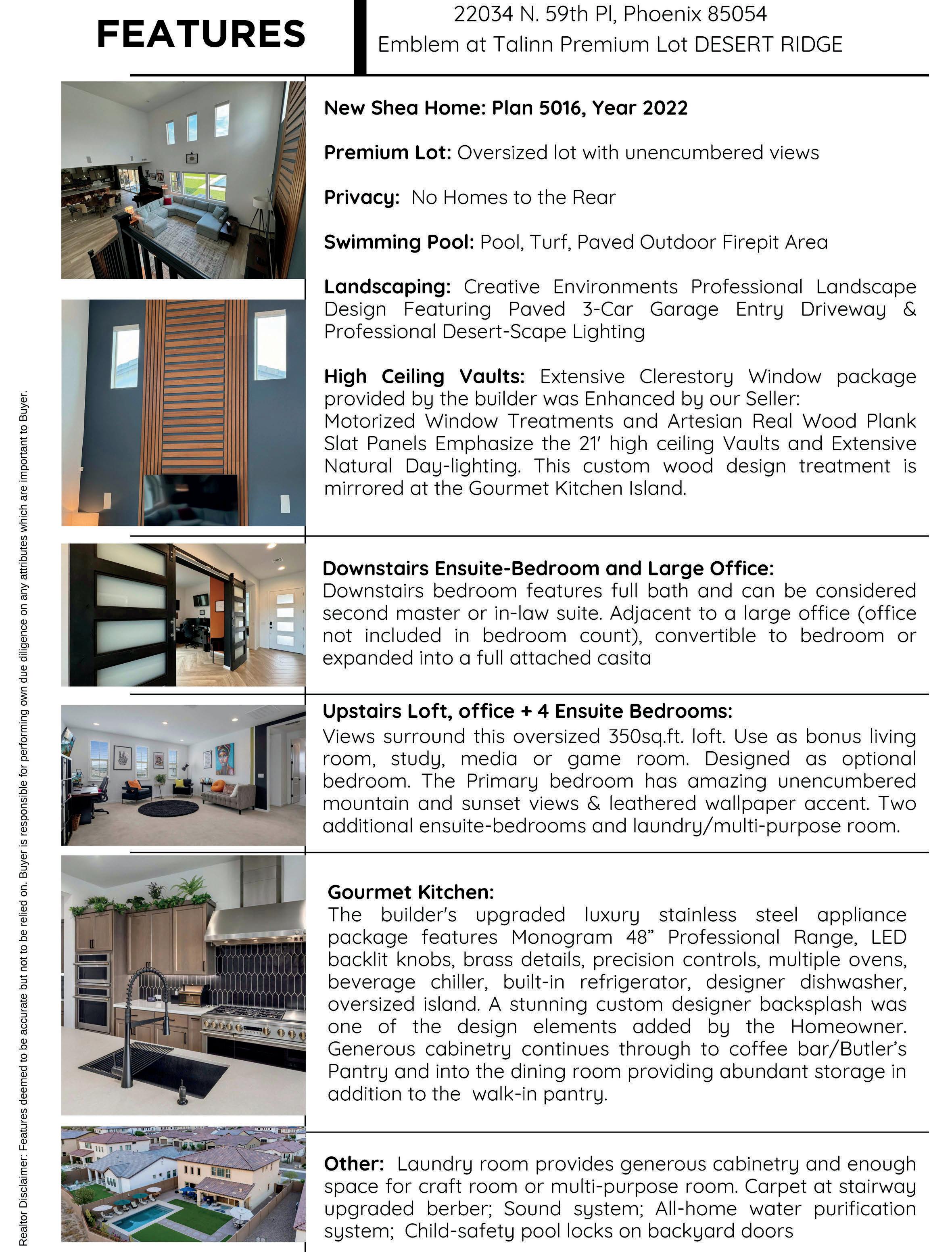 The premium lot placement of this Desert Ridge home disallows any neighboring homes to block the views of the generous window package. These unencumbered views span the great room, dining room, kitchen, the upstairs loft, the Primary Bedroom and the pool & yard. Another highlight of this home is the artisancrafted slat panels that rise from the floor to the 26 foot high ceilings, providing a cohesive warmth to the mass of the room, and a breathtaking accent. The wood plank panels, hand-cut for uniformity in height and width, feature a mix of 2- to 4-inch-wide strips arranged in a striking horizontal and vertical pattern. Each custom piece was hand-stained and meticulously applied to ensure precise spacing and perfect leveling, enhancing the grandeur of the high ceilings and echoing the design at the kitchen island. Before this exquisite treatment was installed, the accent wall received three coats of designer-grade paint to provide a perfect backdrop. Specialty scaffolding was required to navigate the height and proximity to the stairway, ensuring a flawless installation. This artesian feature is a one-of-a-kind custom design of the original owners, who are now selling this lightly-lived in 2022 Shea home.