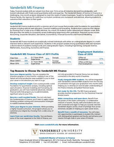 Students Vanderbilt MS Finance students are analytically inclined individuals with either an undergraduate degree in a mathintensive field or relevant work experience. Students in the program possess strong quantitative skills and represent a diverse blend of academic backgrounds and undergraduate majors, including Engineering, Computer Science, Mathematics, Accounting, Economics and Finance.