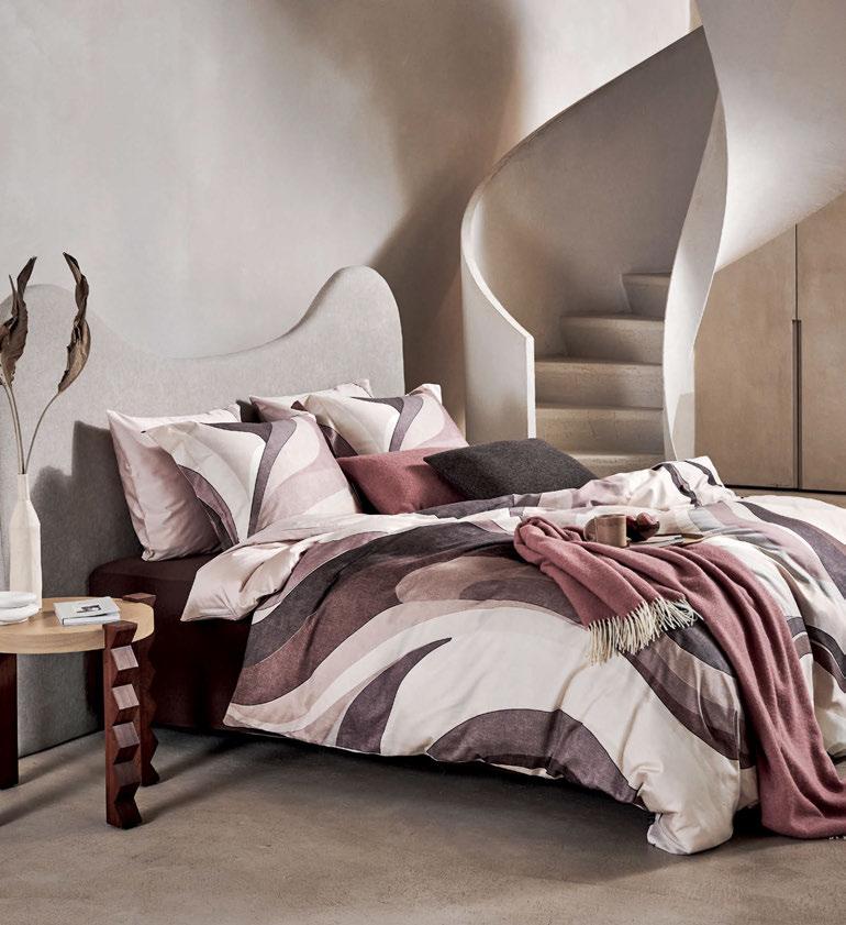 Wavy dessins zoals dekbedovertrek CURVA zijn tegelijk nostalgisch en eigentijds. De kleuren zijn een subtiele knipoog naar de seventies, terwijl de golvende lijnen zorgen voor flow en zachtheid zonder hun grafische kracht te verliezen. Het brengt een strakke eenvoud naar de slaapkamer die desondanks warmte uitstraalt.