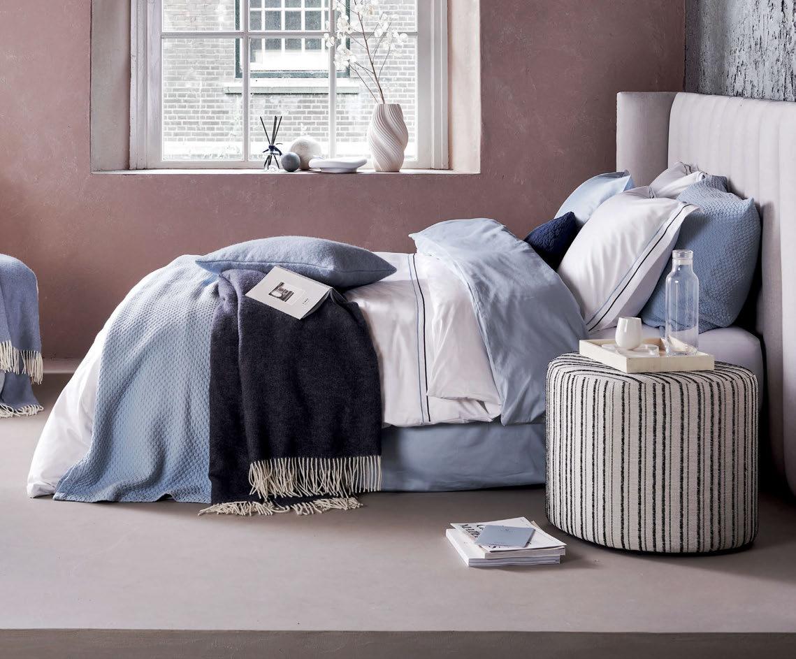 Soms schuilt de kracht in eenvoud: een decoratieve blauwe weeflijn op een wit canvas van 100% katoensatijn (300 thread count) 1-pers. 119,95 | 2-pers. 219,95 lits-jumeaux 239,95