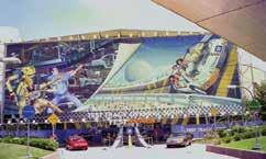 943. A GM Pavilion Test Track Mural Print Set. (Epcot, 1999) A print set of the three Test Track Murals painted for the General Motors Pavilion at Epcot’s Future World. Each print is signed and numbered 76/500 by the artist Tony J. Warren. Measuring 14.75” x 40.25” framed overall, with matte openings of 6.75” x 10.5” each, the piece displays in fine condition with small bits of debris under the plexiglass. $300 - $500