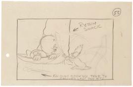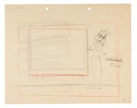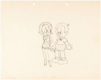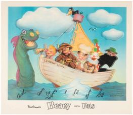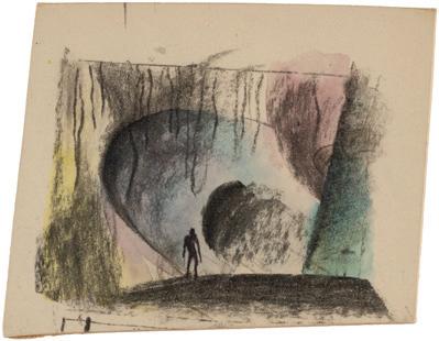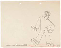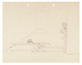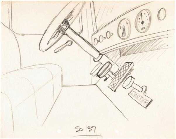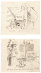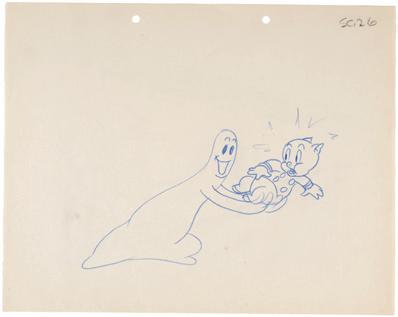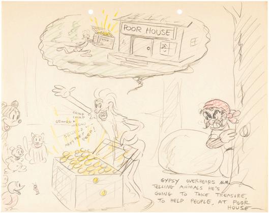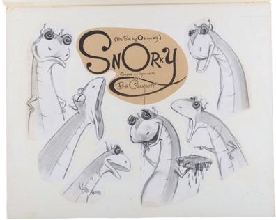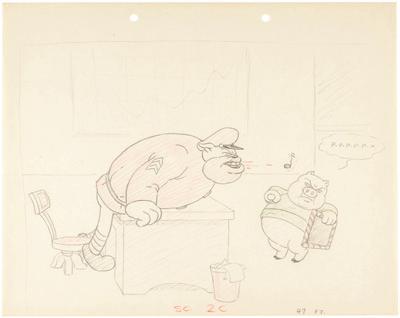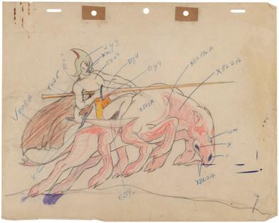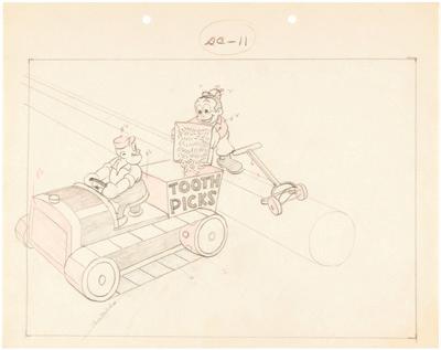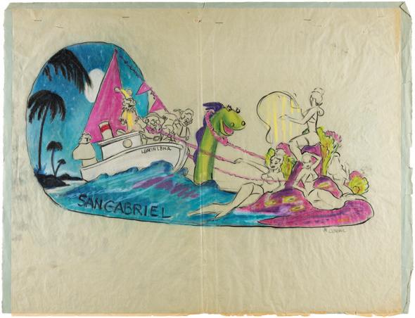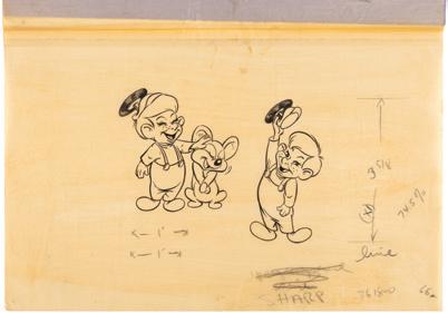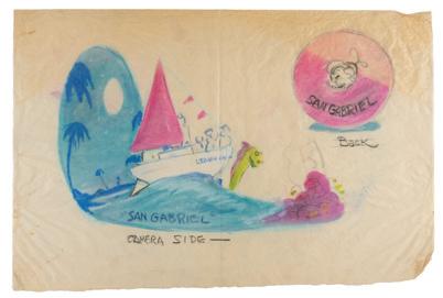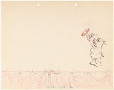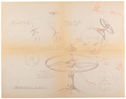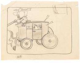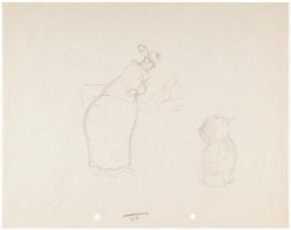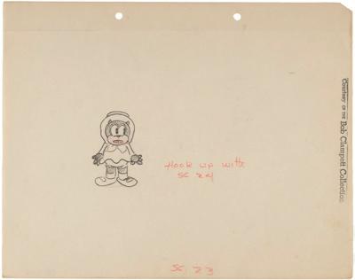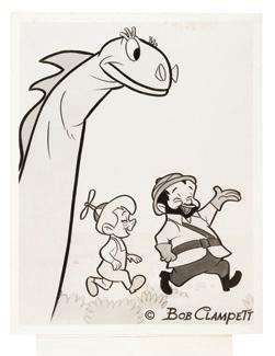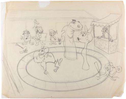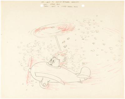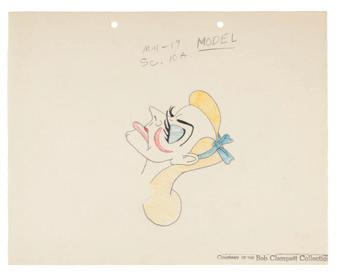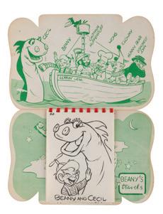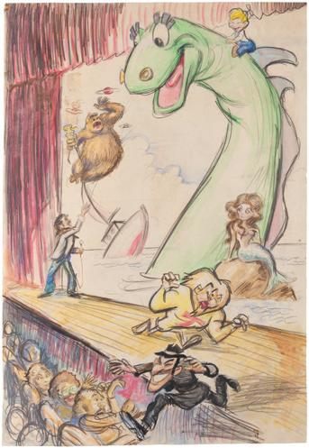 969. “Beany and Cecil” Live Stage Show Concept Art. (Clampett, 1970s) A concept drawing for a proposed live stage show featuring the characters of “Beany and Cecil.” Inspired by Winsor McCay’s “Gertie the Dinosaur” animated and live shows, Clampett conceived of his own version, in which he or a host would interact with his animated characters live. Accomplished in ink, graphite, watercolor, and pastel and measuring 23.25” x 16”, the drawing is in very good condition with light creasing and light discoloration from age. $300 - $500