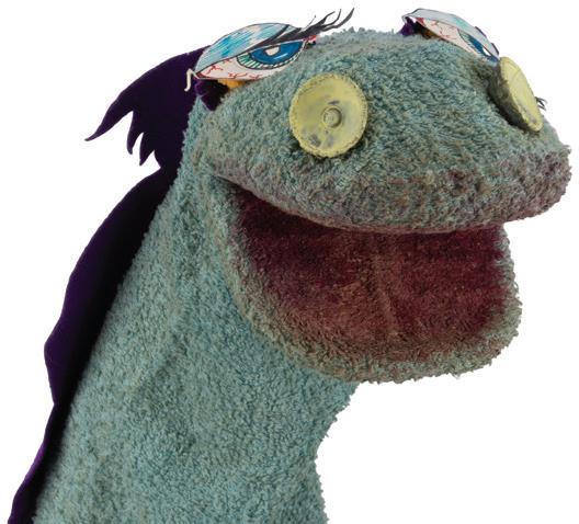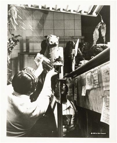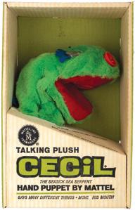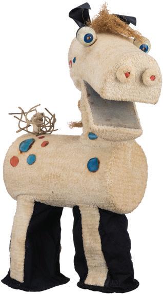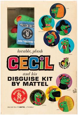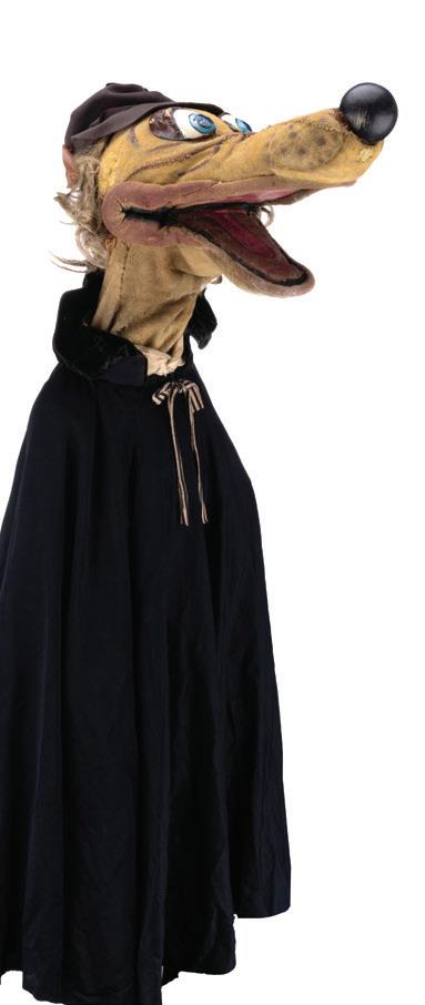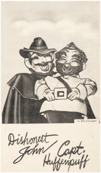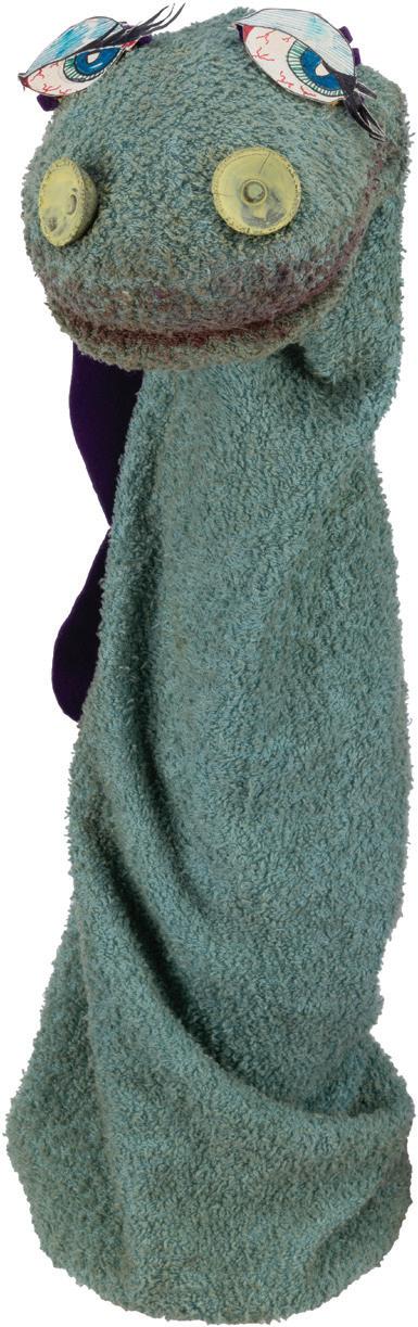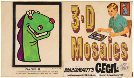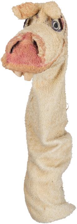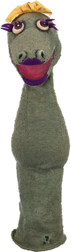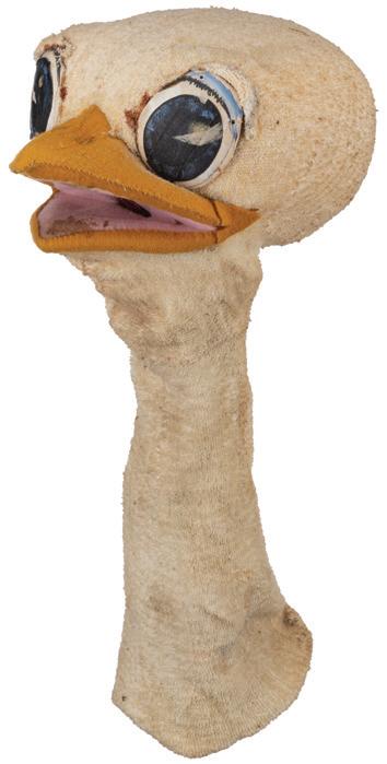 954. Bob Clampett’s Cecil in a Basket Puppet. (Clampett, 1970s) A large Cecil the Seasick Sea Serpent in a Basket hand puppet. In later years, Bob Clampett spoke at public appearances, sharing stories about his career with fans who had grown up with his work. Clampett entertained the audience by voicing and interacting with this Cecil puppet dueing local and TV appearances. Constructed of terrycloth, rubber, plastic, and felt, the puppet measures 10” x 11” and 20” tall and displays in very good condition with discoloration from age and stains and wear from use. The wicker basket attached to the puppet measures 14” in diameter and 6.5” tall and is in very good condition. $2,000 - $4,000