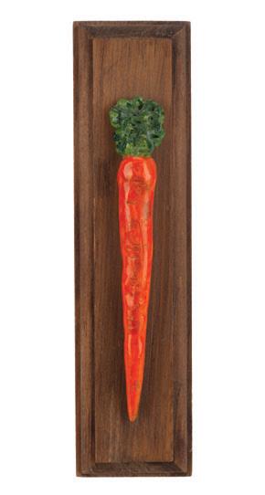 Display. (1970s-80s) A mixed-media carrot display with the name “Yvonne” painted in white on the side. Measuring 2” x 8” x 1” tall, the piece is in very good condition with light wear and cracks to the carrot. $100 - $200