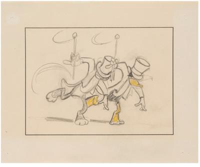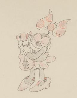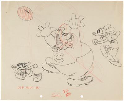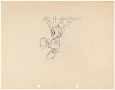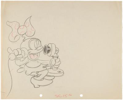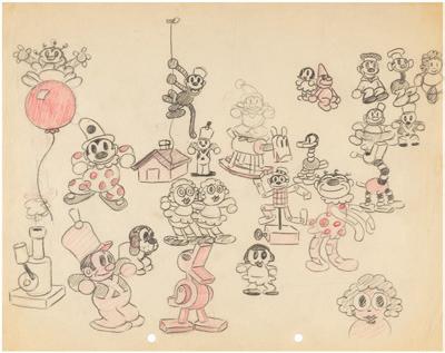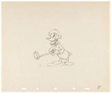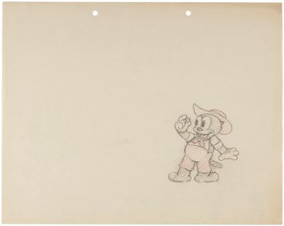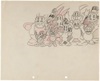 This lot contains the only surviving pieces of Stalling’s handwritten music for “Minnie’s Yoo-Hoo.” Included are 10 instrumental parts for the chorus, written in ink. One typewritten vocal sheet of the chorus to “Minnie’s Yoo Hoo” has lyrics that differ slightly from the final song. One sheet contains a partly written musical intro. The piano part for “Singing chorus Minnie’s Yoo Hoo” is handwritten in pencil, along with a two-page part labeled Mickey Trailer, which appears to have been a shorthand reference to the Minnie’s Yoo Hoo animated piece. A single page full score dated April 22, 1932, titled “Mickey Revue Chorus Mickey Theme Song,” is likely the opening for the short “Mickey’s Revue.” A sheet titled “Yoo Hoo Quartet Club Song” includes notations of “Minnie at Piano” and “Goof Laffs.” Also included is the 1930 commercially printed sheet music, the first Disney song to be published. Overall, an amazing collection of some of the most important music in Disney history. Ranging in size from 9.5” x 6” to 9.5” x 12.5” on staff paper, the collection is in good condition with expected wear and a large tear to the two-page Mickey Trailer sheet. This item does not come from the Bob Clampett Collection. $8,000 - $10,000