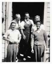 36. A Photo of the Disney Bros. Staff on Kingswell. (Disney, 1925) A rare original photo of the staff at the Kingswell Street headquarters of the Disney Bros. Studio in 1925. Pictured are Rudy Ising, Hugh Harman, Ub Iwerks, Ham Hamilton, Roy Disney, Thurston Harper, and Walker Harman. The 4” x 3” photo is in good condition with some residue on the reverse from being mounted in a scrapbook. The photo was sent to Carl Stalling by Walt Disney and was inscribed on the reverse by Disney; however, the inscription was damaged when the photo was removed from the scrapbook. $200 - $400