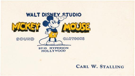 46. A Carl Stalling Walt Disney Studio Business Card. (Disney, 1920s) A Carl Stalling business card from the Walt Disney Studio at 2719 Hyperion Ave. As a top composer in the golden age of animation, Stalling arranged music for over 20 animated shorts at the Walt Disney Studio, then nearly every Warner Bros. cartoon from 1936 until his retirement in 1958. Measuring 3.5” x 2”, the card is in very good condition with light edge wear and a light spot of discoloration. $500 - $700