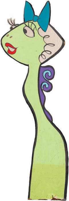 928. A Poolside Cecilia McCoy Display. (Clampett, 1960s) A wooden cut-out of Cecilia McCoy from “Beany and Cecil,” that decorated Bob Clampett’s backyard pool area. Measuring 71” x 22.75” x 0.25” thick, the display is in fair condition with edge wear, peeling, scratches, cracks, soiling, and light discoloration at the bottom. Due to size and weight, this item requires special shipping arrangements. Please inquire before bidding. $300 - $500
