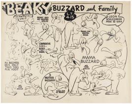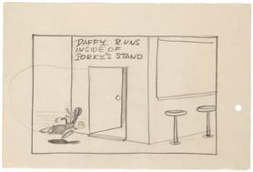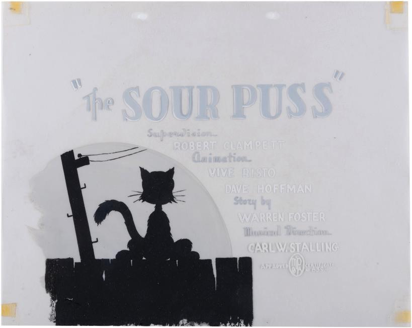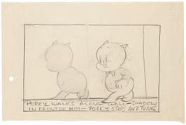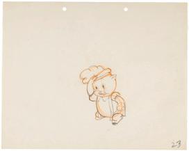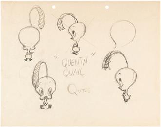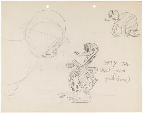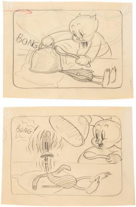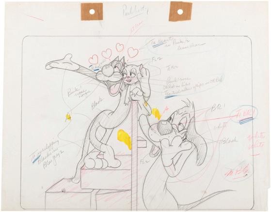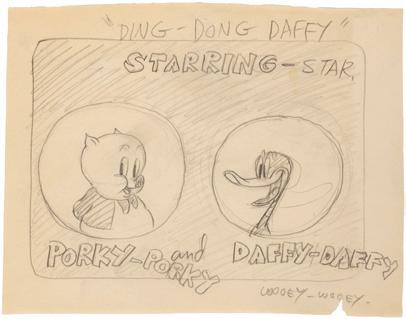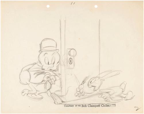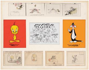 - An overview of Clampett’s creations at Schlesinger including four 9” x 7.25” character cels of Tweety, Sylvester, Daffy Duck, and Porky Pig, two original 5” x 6” storyboard panels of Daffy Duck and Yosemite Sam, and an 8” x 10” photo model sheet of Tweety.