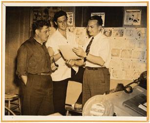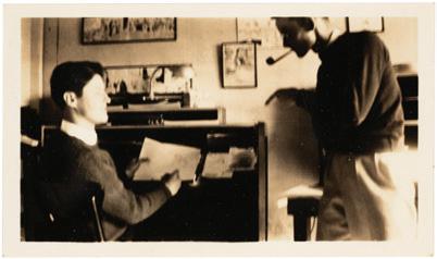 47. A Photo of Carl Stalling and Art Turkisher. (MGM, 1934) A photo of composers Carl Stalling and Art Turkisher working on the score to “Jungle Jitters” from Ub Iwerks’ Willie Whopper series of shorts. Measuring 8” x 10”, the black and white glossy photo is in very good condition with light corner wear and paper remnants from a scrapbook to the reverse. $100 - $200