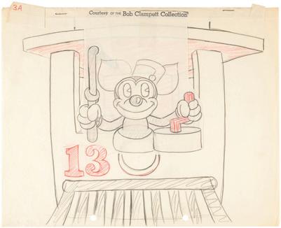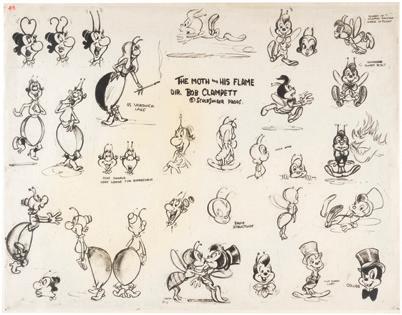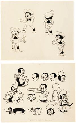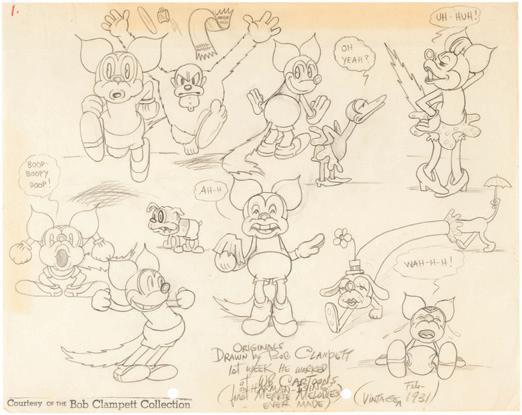 - A board on early Disney animation featuring a Mickey Mouse model sheet handdrawn by Bob Clampett himself. It also includes a Mickey photo model sheet, a photostat “Trailer Troubles” model sheet (released as “Mickey’s Trailer”), and a rare early Donald Duck photo print model sheet.