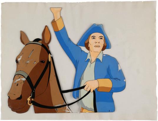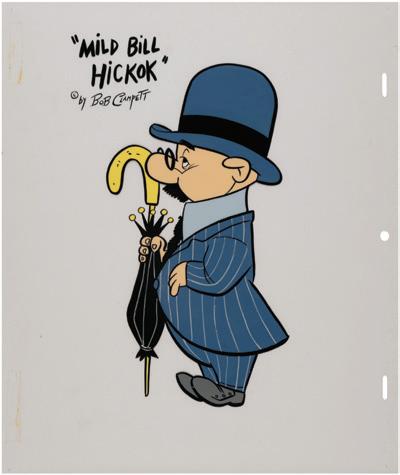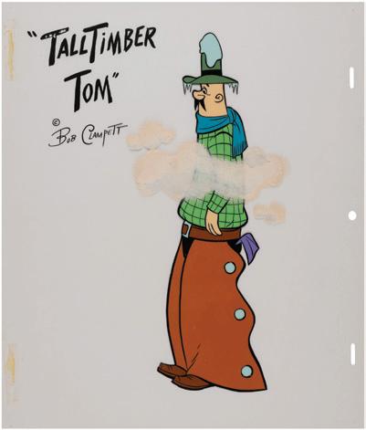 958. A Tall Timber Tom Hand-Painted Cel. (Clampett, 1970s-80s) An original hand-painted cel of Tall Timber Tom with a Bob Clampett copyright. With an image size of 7.5” x 11” on a 10.5” x 12.5” cel, the piece is in good condition with paint loss, scratches, pinholes, and tape residue from display. $100 - $200