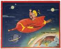 Printer’s Block. (Clampett, 1950s-60s) A large printing block featuring Bob Clampett’s characters Beany, Cecil, Thunderbolt the Wondercolt, Willy the Wolf, Clowny, and Captain Huffenpuff, on a train with sponsor products from Challenge Dairy, Nehi, and Malt-O-Meal. Measuring 7” x 9.25”, the block is in very good condition with scratches, scuffs, labeling tape and wear from use. $100 - $200