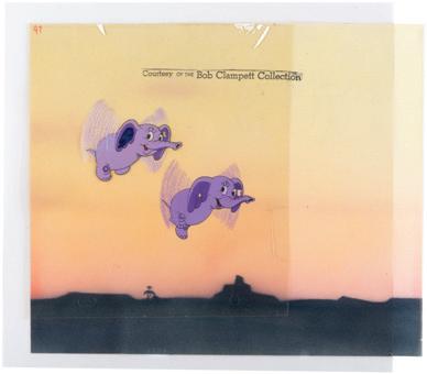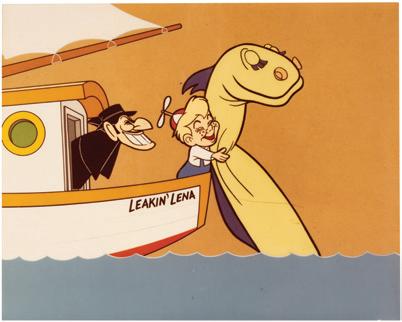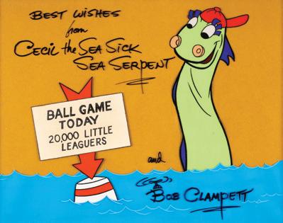 953. A “Cecil the Sea Sick Sea Serpent and Bob Clampett Present” Cel. (Clampett, 1970s) An original multi-layer presentation cel of Cecil and a silhouette of Bob Clampett. Clampett projected this cel at his live speaking engagements, where he would perform with his “Cecil in a Basket” puppet. Measuring 15” x 17.25” the cel displays in good condition with areas of paint transfer from Cecil’s basket, nose, mouth, and lower body cel layer to the last layer, light surface scratches and scuffs, and light warping from age. $800 - $1,000