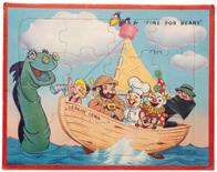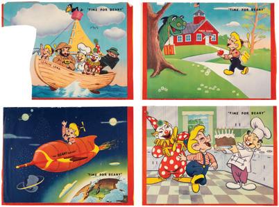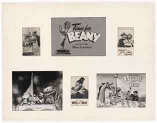 - Two boards display reprints of 32 storyboard panels from the Tweety cartoon “Birdy and the Beast,” hand colored by Clampett. original hand-painted “Time for Beany” title card proudly displaying an Emmy win for the series. Also included are two publicity stills and three fan cards for this series and Willy the Wolf.