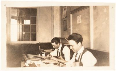 A rare early photo of Ub Iwerks and Hugh Harman in the Kansas City Laugh-O-Grams Studio, where Carl Stalling first teamed up with Walt Disney to create music for Walt’s Laugh-O-Grams when screened at the Isis Theatre. The 4.5” x 2.5” photo is in good condition with pinholes in the corners. $200 - $400