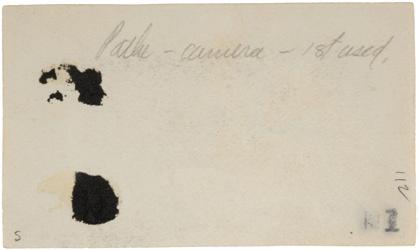 28. An Original Photo of Walt Disney with his Camera. (Disney, 1923) An extremely rare original 1923 photo of Walt Disney. The 2.5” x 4” photo came from the estate of Carl Stalling and features Disney in the yard of his Uncle’s House at 4406 Kingswell Ave in Los Angeles with his Pathe’ Motion Picture Camera. Walt himself inscribed in pencil on the reverse–“Pathe-Camera-1st Used.” The photo is in good condition with some paper residue on the back from a previous mounting in a scrapbook. $1,000 - $2,000