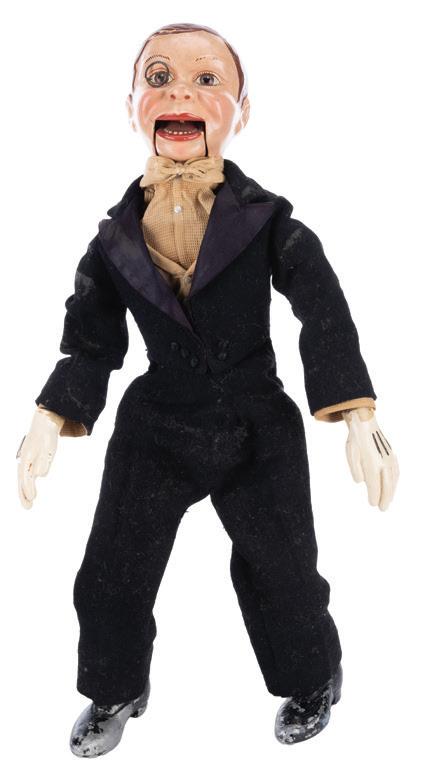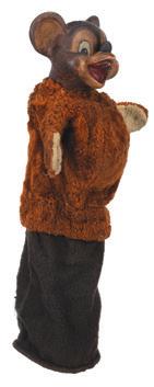 22. A Rare Charlotte Clark Mickey Mouse Doll. (Charlotte Clark, 1930) A rare Charlotte Clark Mickey Mouse Doll. This 18” version of the doll was likely manufactured at the Studio Shop where Bob Clampett worked. The bottom of the doll’s feet are stamped with Walt Disney’s copyright and George Borgefeldt & Co., the distributors for Disney Merchandise at the time. With a velveteen body and oilcloth eyes, the doll is in good condition with a tear to Mickey’s left arm exposing the stuffing and staining from age throughout. It still presents well overall and is a wonderful example of a piece of Disney History. This item does not come from the Bob Clampett Collection. $2,000 - $4,000