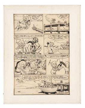 5. A 1928 Heavyweight Boxing Original Clampett Comic. (Clampett, 1928) In the late 1920s, sports comics were very popular in the newspaper, and a 15-year-old Bob Clampett was sure to try his hand at it. In this comic, Clampett lampoons the boxing match where Gene Tunney - a former Shakespearean lecturer at Yale who was unpopular among sports fans for his unexciting brawling styleeasily defended his heavyweight title from Tom Heeney’s challenge. Measuring 14” x 12” with an image size of 12” x 9”, the artwork is in very good condition with very light creasing and staining from age. $800 - $1,000