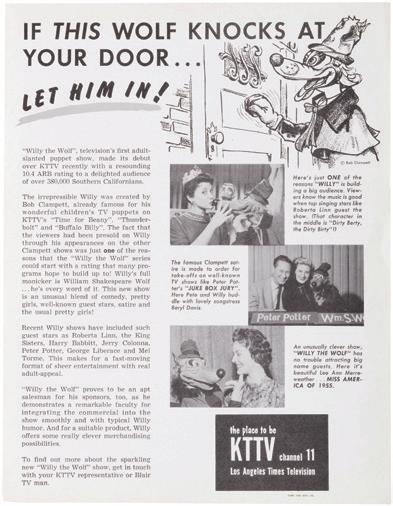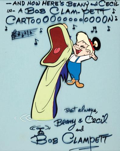 Robert E. Clampett was one of the pioneering animator-directors at Warner Bros. from 1931 to 1946. He next mastered puppetry, as from 1949 to 1955 Clampett’s studio had one live weekly and three daily puppet shows televised live, one of which, “Time For Beany,” won the Emmy Award for Best Children’s Show three times in 1950, 1951, and 1953. Beany and Cecil returned to television in 1962 as one of the earliest cartoon series on TV. A family man, Bob co-wrote music for the show with his wife Sody, who came up with the opening theme song’s signature sign-off, “And now here’s Beany and Cecil in a Bob Clampett cartooooooon!”