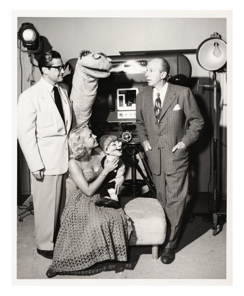 45. A Carl Stalling and Disney Orchestra on Stage Photo. (Disney, 1931-34) A very rare publicity photo of Carl Stalling and musicians on the soundstage at Disney’s Hyperion Avenue Studio. Also present is Marcellite Garner, who was the voice of Minnie Mouse throughout the 1930s. The photo measures 10” x 12” with an image size of 7.5” x 9.5” and is in very good condition, with slight adhesive staining typical of film tape of this age. $100 - $200